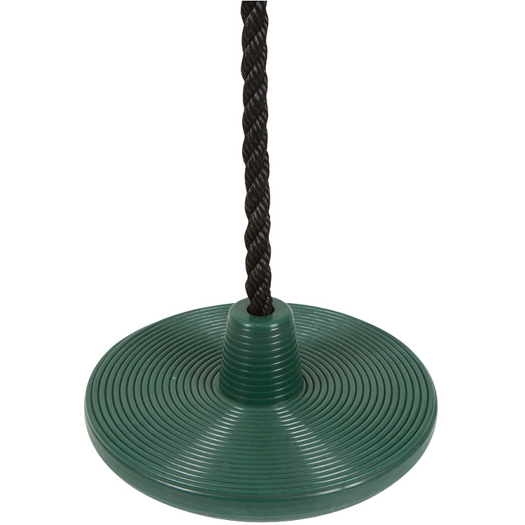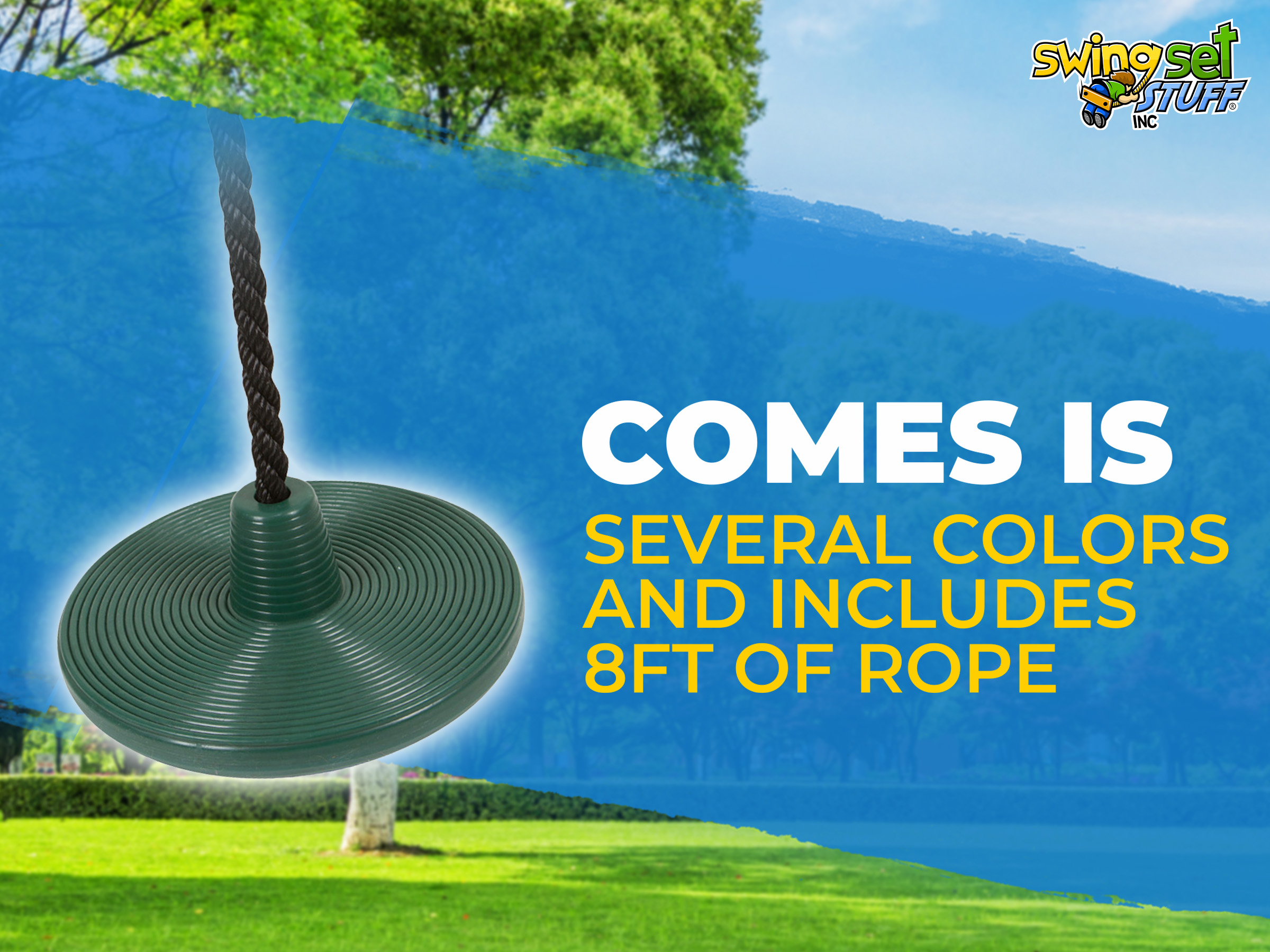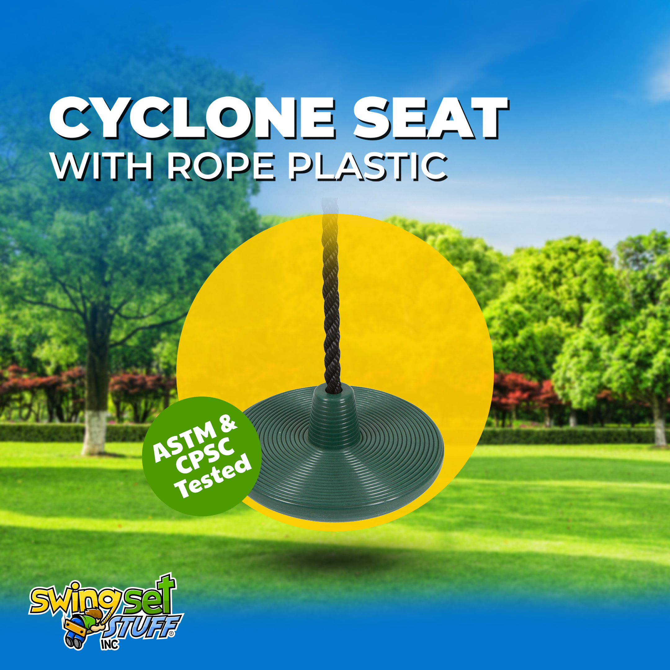 This is a cyclone swing seat molded from high density polyethylene that comes with 8 foot of rope. The rope is 3/4" in diameter and the seat is 11 3/4" in diameter.
