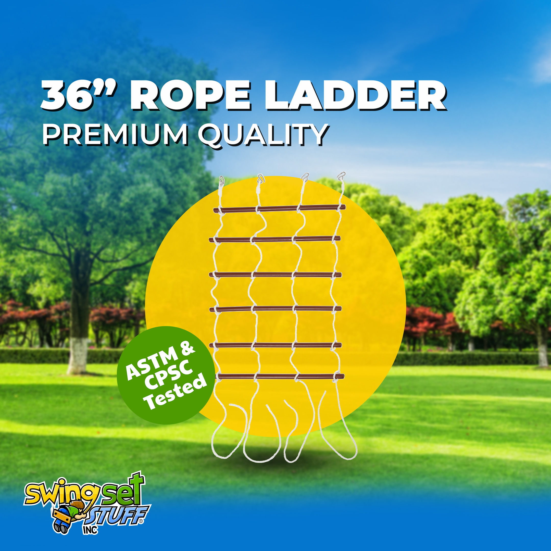 This rope ladder is 36" wide and approx. 9ft long(hook to end of rope). There are six rungs with 9" between each rung. It has 1 3/8" diameter hardwood dowels. The rope is 1/2" in diameter. The ladder comes with 4 pelican hooks across the top.