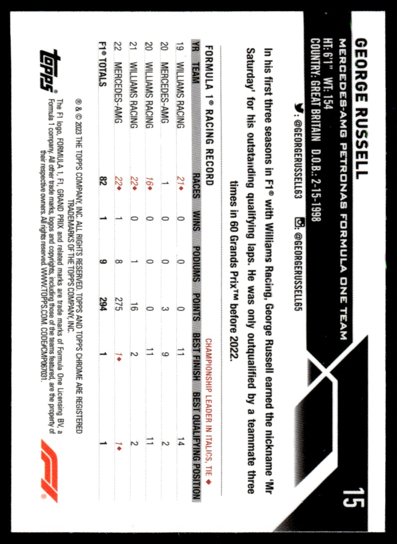 2023 Topps Chrome Formula 1 George Russell Mercedes-AMG Petronas F1 #15