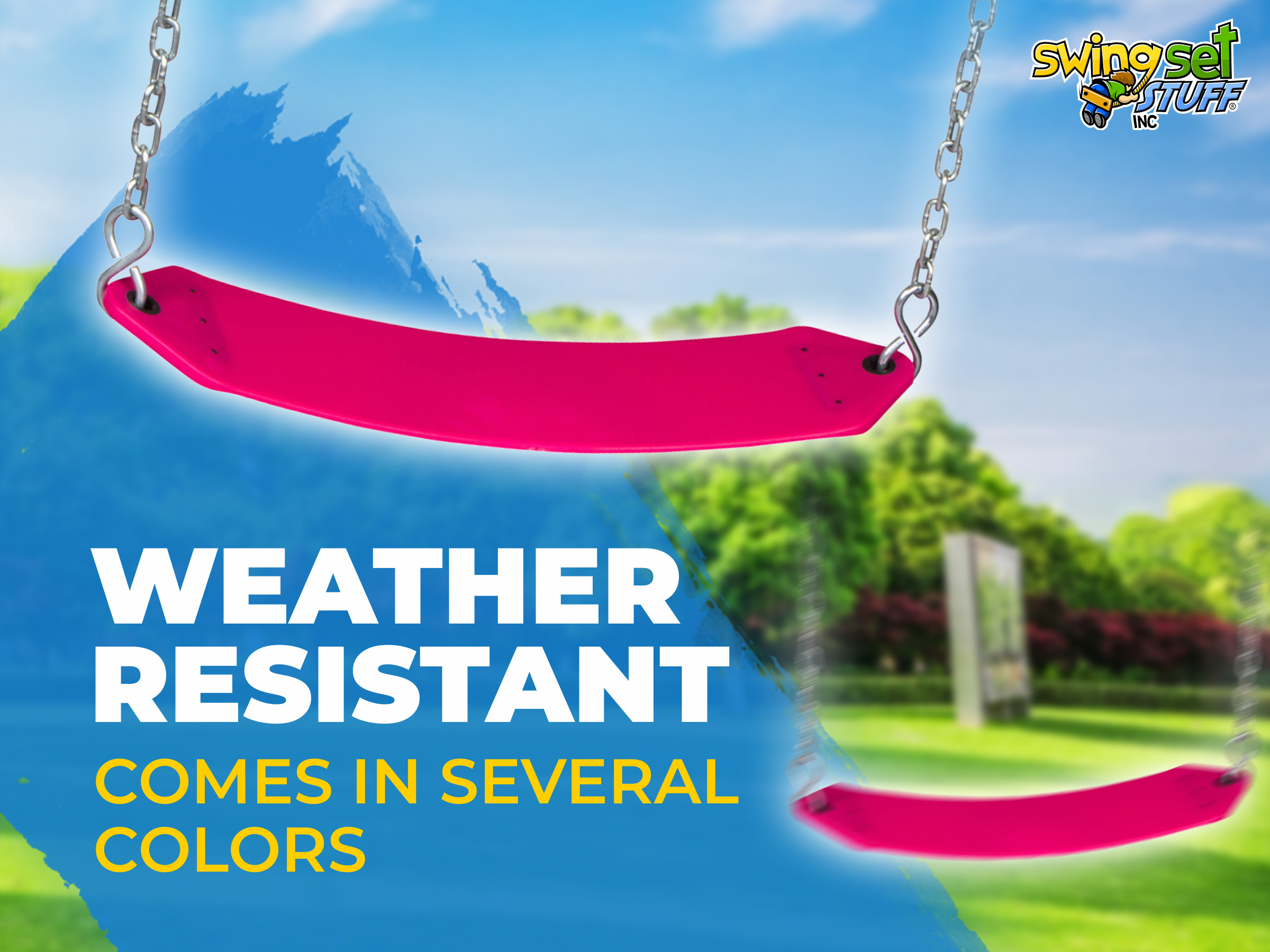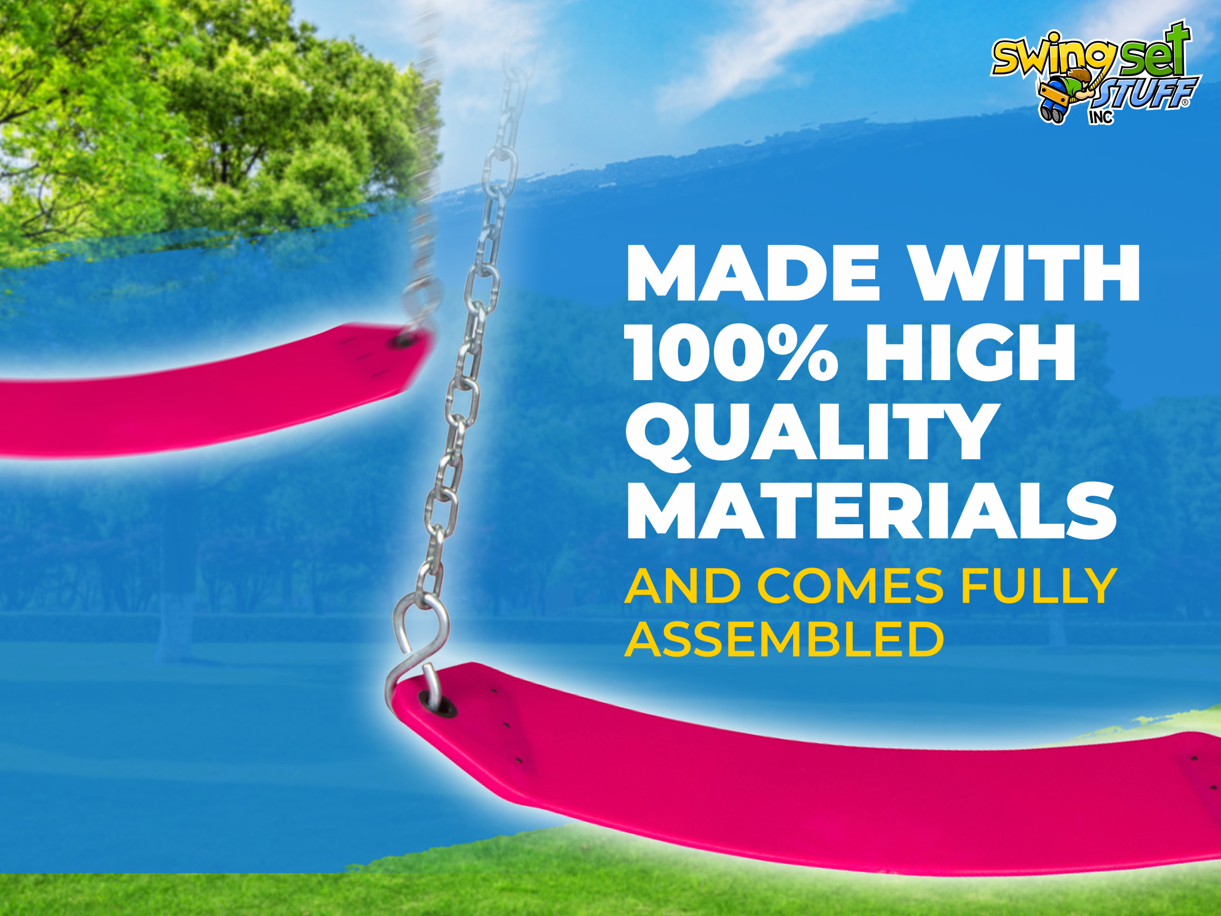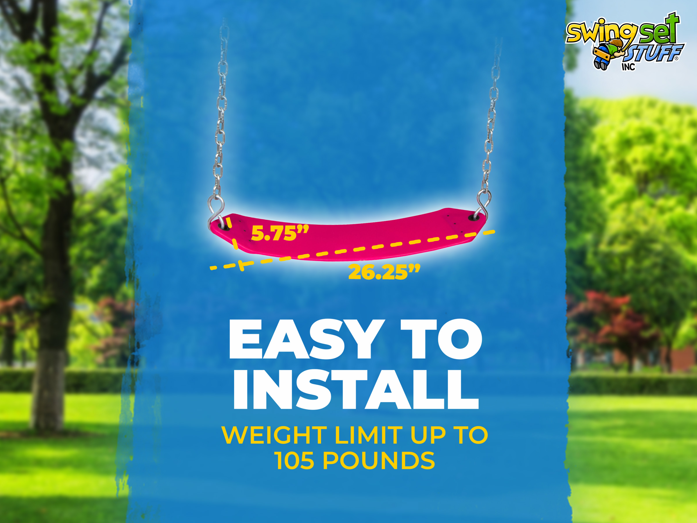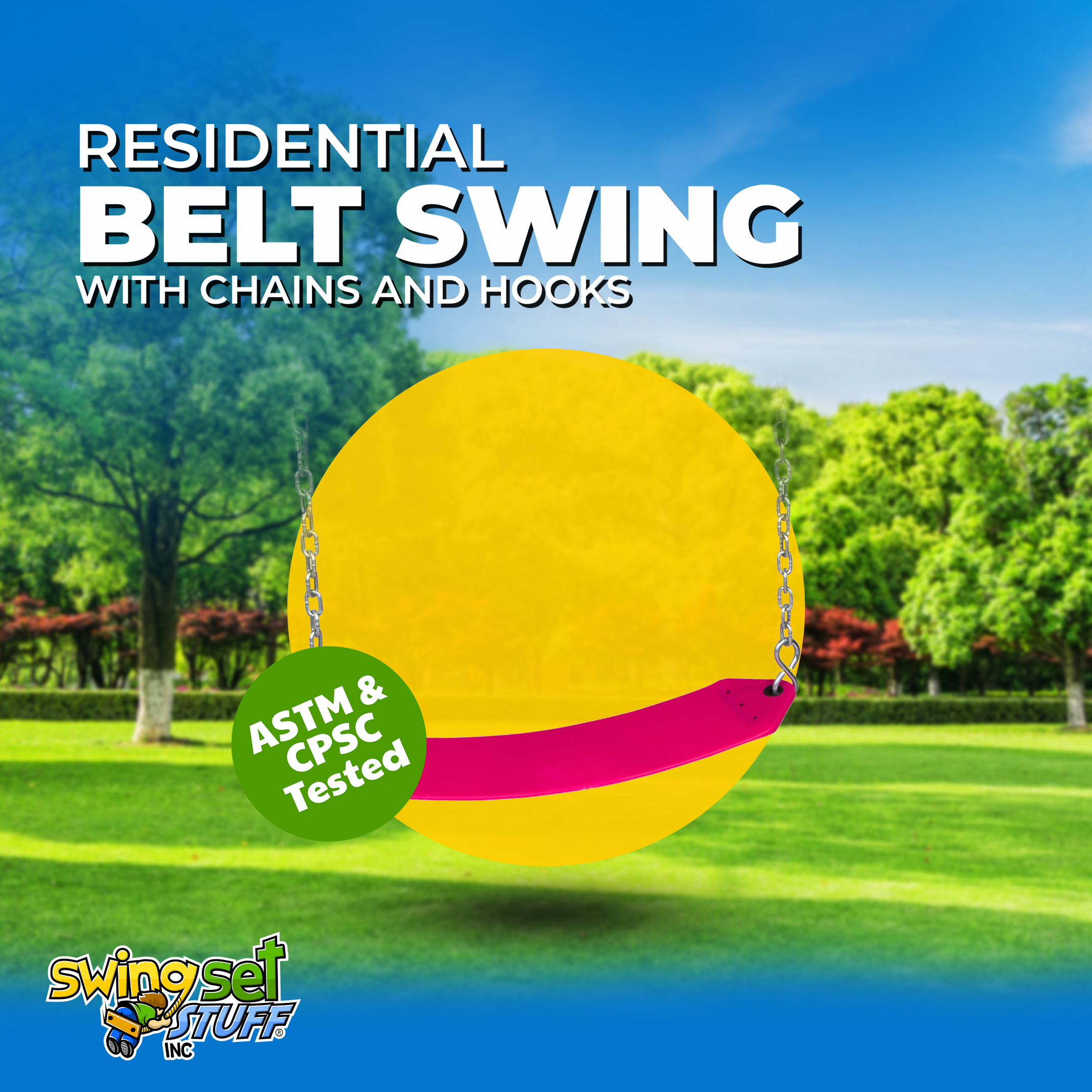 This is for one residential belt seat 25 1/2" L x 5 1/4" W fully assembled and ready to connect to a swing set. This belt swing is fade resistant. It comes with two large s-hooks, two 5 1/2ft chains, and two quick clips for easy attachment. The chain is 3/16" zinc plated with standard length of the 5 1/2 ft chain. Residential use only up to 105 lbs. Please visit our Ebay store for additional products and colors.