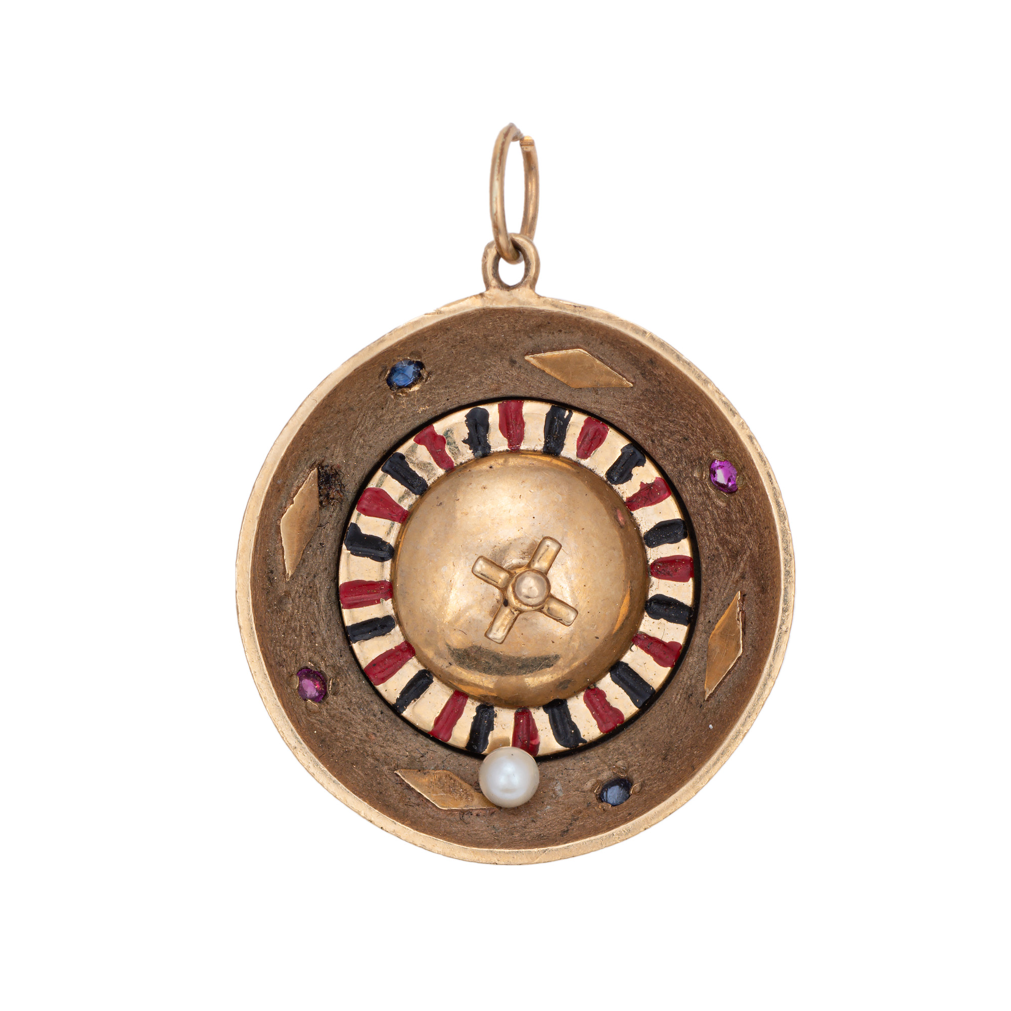 ?Overview: Finely detailed vintage gemstone set roulette wheel charm crafted in 14k yellow gold (circa 1960s to 1970s) The roulette wheel moves in 360 degree motion, with black and red enameled markers adding lifelike detail to the charm. The bale measures 5mm and can accommodate a thin to thick chain if desired. Medium in scale the piece is ideal worn as a pendant on a chain or attached to a charm bracelet.