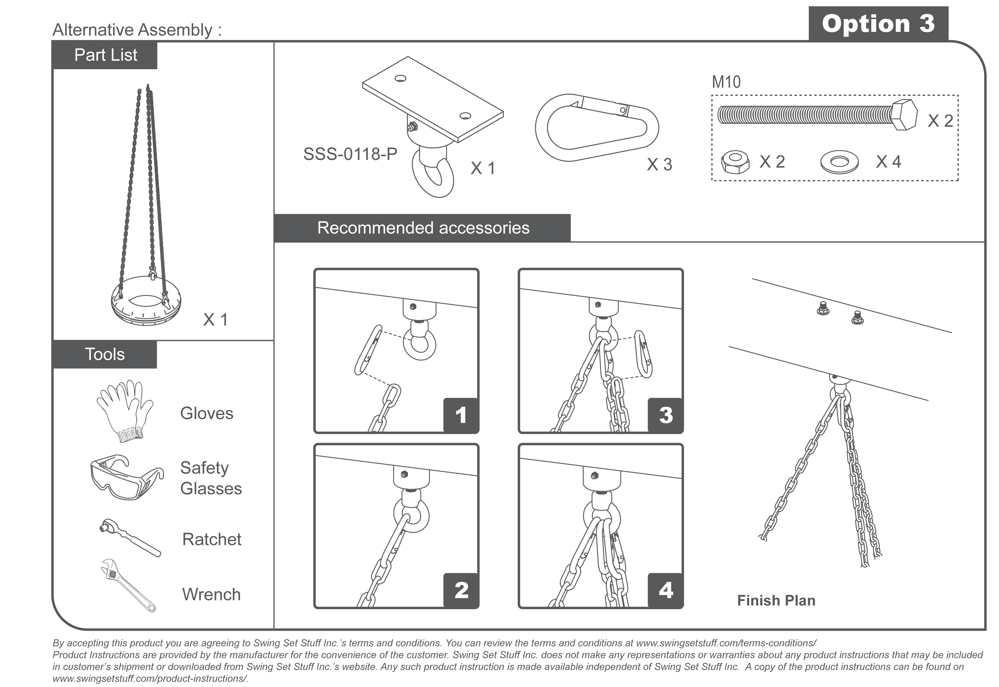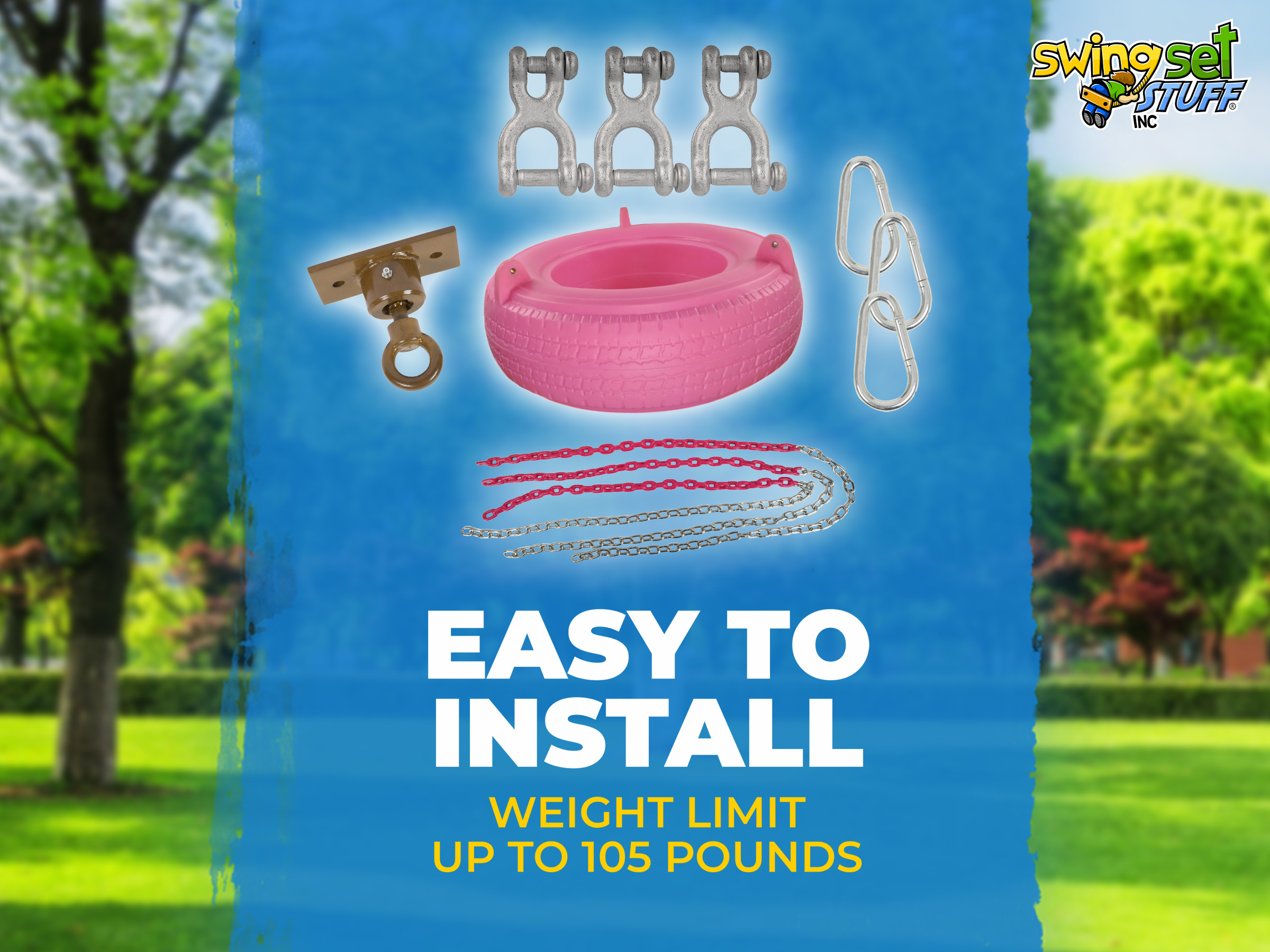 This kit comes with 1 Deluxe Rotomolded tire, 3- 5 ½ ft coated chains with 3/16" chain under coating, 3 double clevises to attach chain to tire, 3 spring clips to attach top of chain to swivel and a light duty tire swivel.