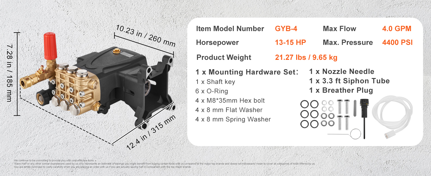 Pump out the Competition: Looking for a high-performance pressure washer pump? Look no further than the VEVOR replacement residential pump! With 4400 PSI max pressure and 4 GPM max flow rate, it's perfect for daily cleaning tasks such as walls, sidewalks, and vehicles. Save money by replacing your pump instead of buying a whole new power washer.