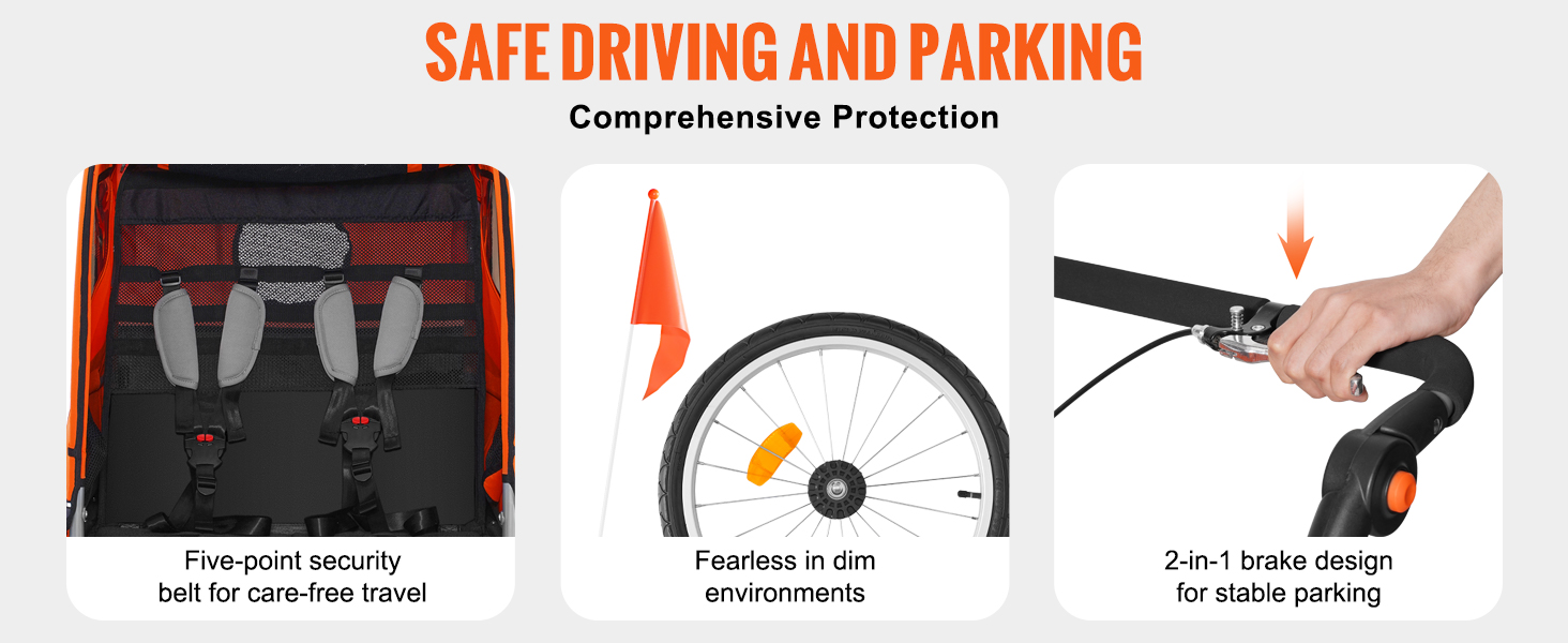 Security First: Our bicycle trailer ensures all-around protection with its hub spring suspension design, effectively absorbing shocks. With the 2-in-1 security handbrake, you can smoothly decelerate and park securely. Plus, bright reflectors make sure you're seen during the ride, adding an extra layer of security.