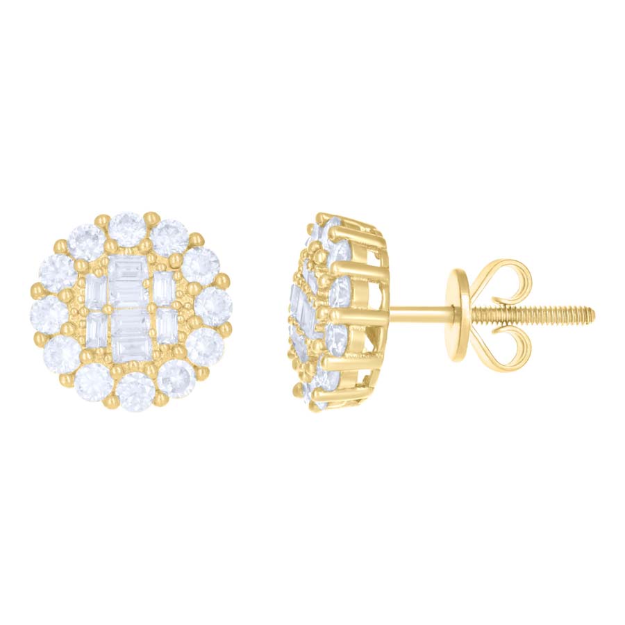 Stunning pair of studs added to our JFL moissanite earring collection. These earrings are crafted in solid 10K Yellow Gold. Radiant with 1.32 Ct. t.w. of moissanites, these stud are high polished for a lustrous shine. These particular stud consist of Round & Baguette cut white moissanites in Prong setting, making the overall appearance lustrous. Screw-backs for secure wear, these earrings are a classic addition to your jewelry collection. Perfect size, these studs are 10mm wide. These moissanite studs are hand picked and matched to be uniform.