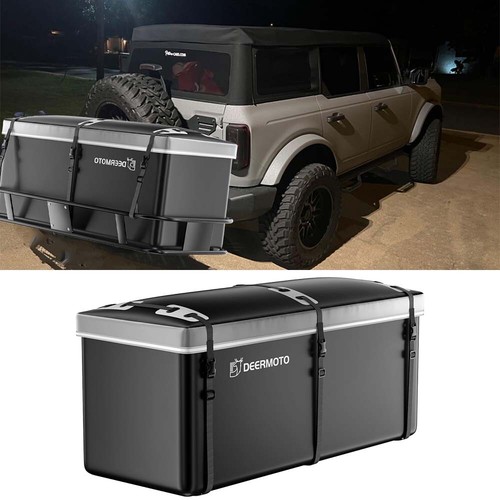 Car hitch cargo carrier bag made of 100% waterproof heavy-duty 600D abrasion-resistant PVC fabric that can withstand harsh weather conditions and rough handling.