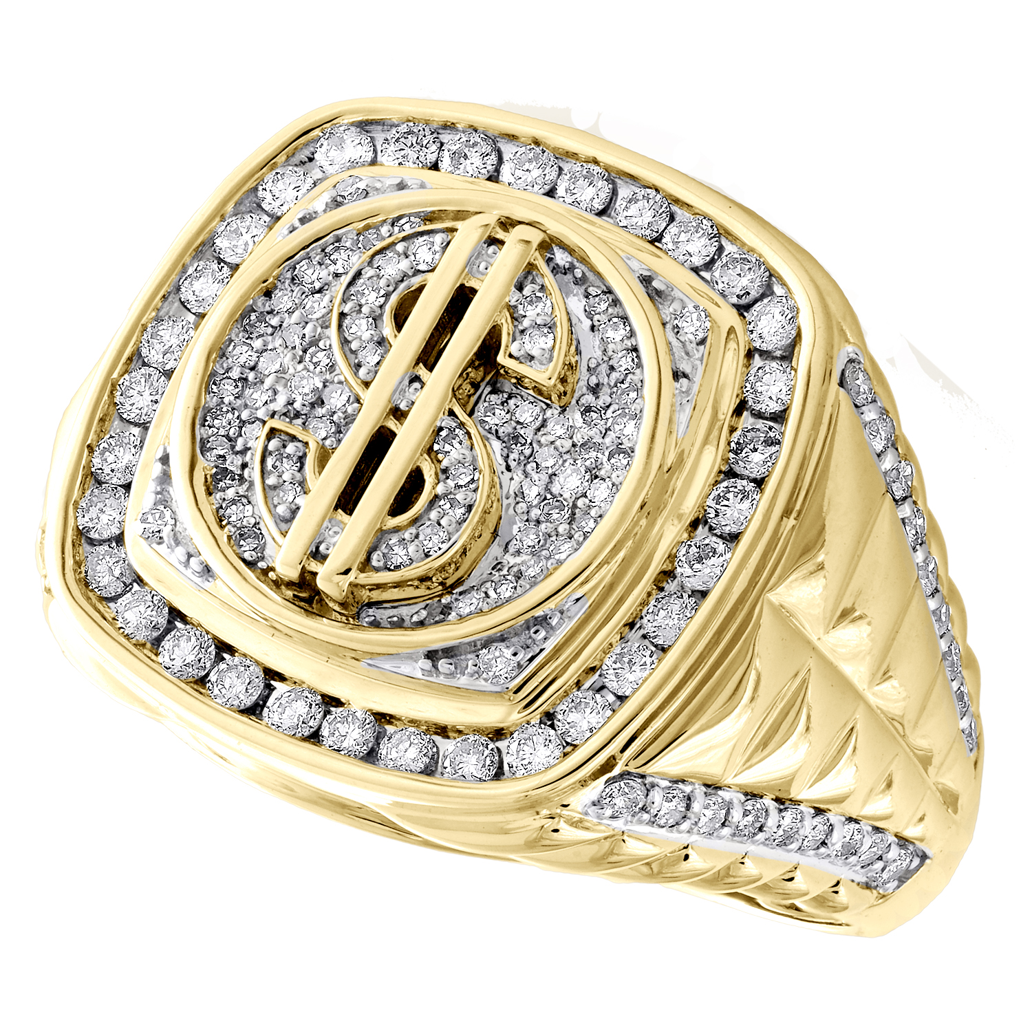 A bold and manly look, this sparkling Money / Dollar Sign Diamond Ring is just the perfect style for him. This versatile ring is brilliantly crafted in solid 10K Yellow Gold. This ring features cluster of sparkling genuine round diamonds set in 19mm frame. This ring design was intricately thought out so it can be worn for any occasion, no matter how casual or fancy. Square Statement Emoji design is in solid gold with genuine diamonds, and has a masculine look. Make an impression with this exclusive bold fashion statement ring. Radiant with 1 ct. t.w. of genuine white round diamonds and high-polished to a lustrous shine. Statement ring weighs approx.10.4 grams. All diamonds are 100% genuine and matched to perfection throughout. The diamonds are securely held in prong setting, making the overall appearance larger and lustrous. Available in size 10, can be sized upon request for additional charge.