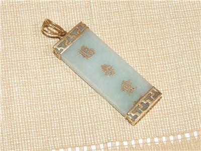 ...Rectangular Shaped Pale Mint Green Jade Pendant with 3 Gold Asian Symbols...