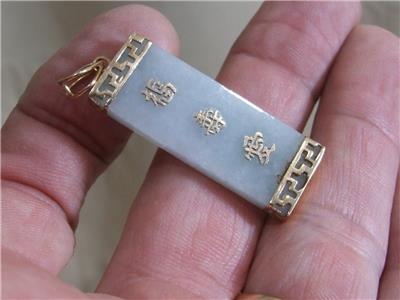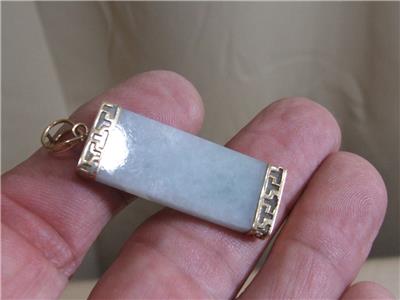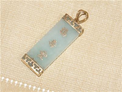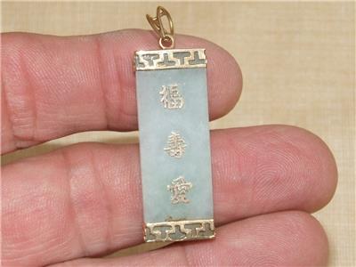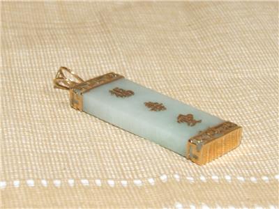 1.5" Mint Green Jade Rectangle Pendant 14k Gold Setting w/ 3 Asian Symbols 9.6gr