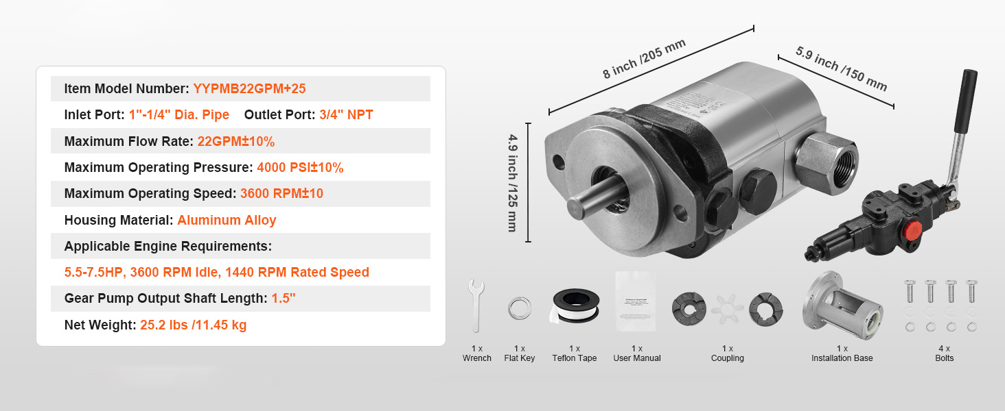 Our hydraulic gear pump comes with a complete set of accessories, including a hydraulic directional control valve, an installation base, coupling, wrench, flat key, and Teflon tape. It makes installation and maintenance a breeze. We've got you covered with everything you need.