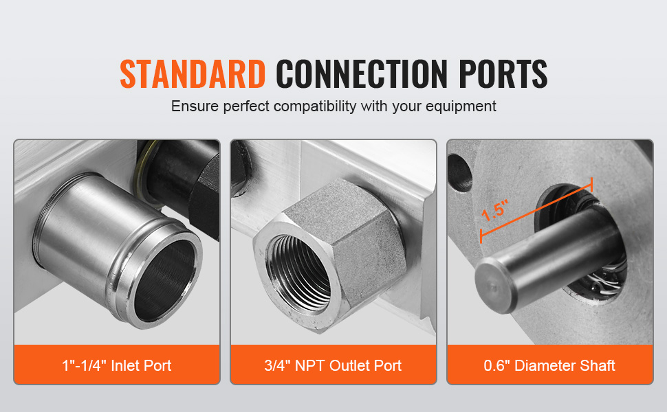 Our 2-stage log splitter pump features a 1-1/4'' inlet and 3/4'' NPT outlet, boasting exceptional compatibility for various pipe connections. It is designed with the carefully crafted shaft length and diameter ensure smooth operation while minimizing energy loss.
