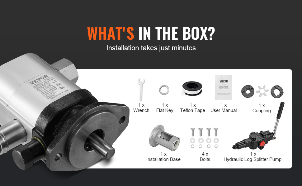 Our log splitter pump kit comes with an installation base and coupling, requiring only four bolt holes for secure mounting. No need for specialized skills or complicated tools– you'll have it up and running in no time, saving you both time and effort. Enjoy the convenience of easy setup!