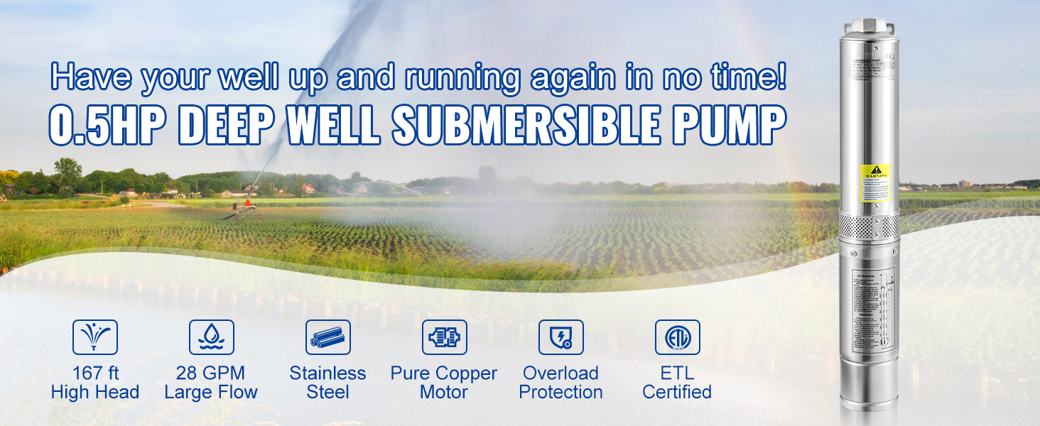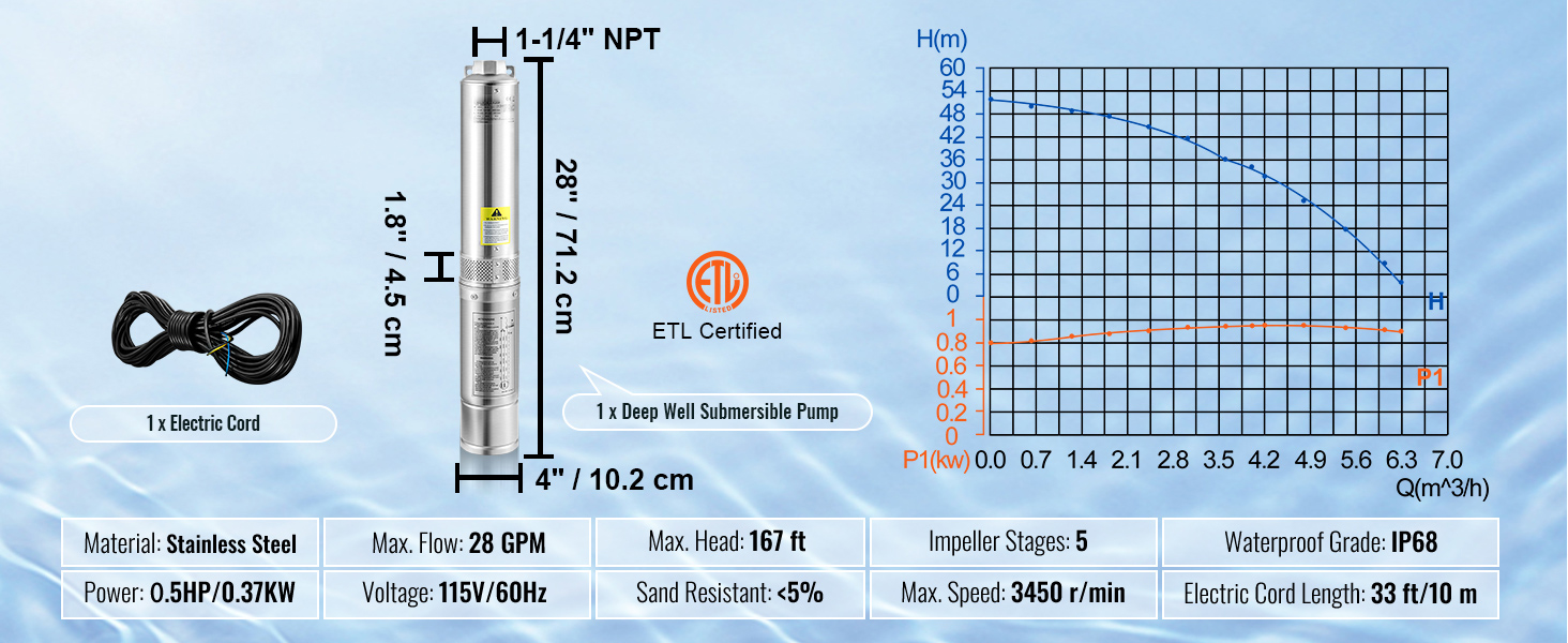 - Enhanced Pump Flow & Head: Power: 0.5HP, 115V; Diameter: 4" (for 4" or bigger well casing); Discharge: 1-1/4" NPT. This deep well submersible pump is designed with 5-stage thermoplastic impellers, providing 28GPM max flow and 167 ft max head. It comes with a 33 ft electric cord, making life without modern plumbing a lot easier. Pump out your worries with ease and relax. No challenge is too big for you.