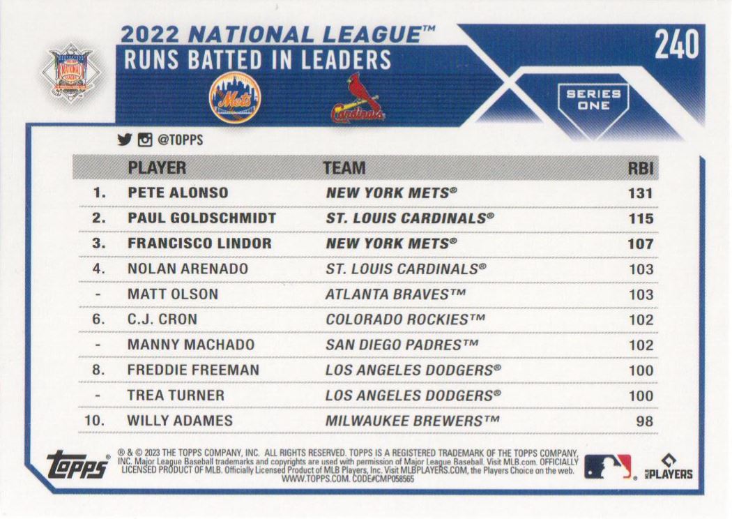 | Description: | Paul Goldschmidt/Pete Alonso/Francisco Lindor | | Category: | Baseball | | Year: | 2023 | | Product: | Topps Chrome Sapphire | | Team: | St. Louis Cardinals/New York Mets | | Card Number: | 240 | | Dimensions: | 3½" x 2½" | | SKU: | BL 90DR0001 R01 B (76) |