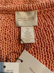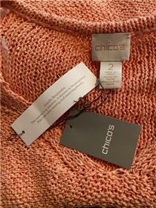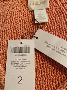Read everything completely below as I do not accept returns on any clothing due to personal hygiene issues. ALL AUCTION SALES ARE FINAL. Compare measurements to your other clothing for proper fit. 9 Pictures are furnished of exact item including a Chicos Size Chart. Brand New With Tags CHICOS Pullover Sweater in Size "2" M/L in the color GINGERED PEACH. Tiny Clear Sequins throughout cause Sparkle. Ribbing around Bottom & Cuffs. Unique Scoop V Neck. Recommend Hand Wash. Fabric is made from 58% Cotton, 29% Polyester & 13% Viscose. Knitted Diagonal Vertical Seam Designs. Lots of Stretch. Heavyweight. High Quality (see pics) Compare measurements provided by me for a perfect fit. It really works! Armpit to Armpit doubled is a 50" Bust. Length from Shoulder to Hem is 32" long. Hem Around Bottom is 44" with more to Stretch. Sleeves have a 20" Inseam. Gift Giving Quality. Beautiful Color with Mild Sparkle. Its a Beauty! Garment will be shipped US Priority with Tracking Data furnished. All Sales are Final. No Returns. Buy It Now Auction with Shipping Tracking Information. All sales on this Garment are final, No Returns, Exchanges or Refunds. No Exceptions. I do not auction Junk. Please know your true sizes, manufacturers, this fabric and what looks good on you. Please double click on pictures above to Supersize Pictures. My health has taken a complete negative 180 turn so it is time to thin out my herd. My poor home is sinking into the ground. As with all of my auctions, this is a Buy It Now Auction with Tracking Data. Again NO Returning of Item! All Sales on Final. This is an Auction. Email with any questions or issues. I answer quickly. Thank you for stopping by this auction and I hope you will look at my many others. Blessings...