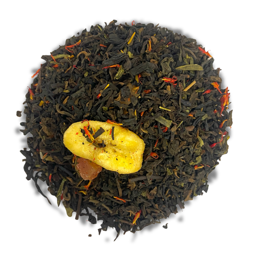 Pu Erh, Papaya (Papaya, Zucker), Banane (Banane, Kokosöl, Rohrzucker, Honig), Grüner Tee China Sencha, Aroma, Saforblüten.
