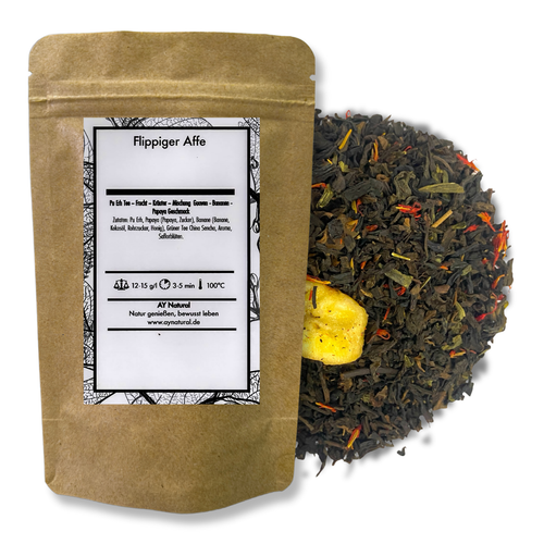 Der Flippige Affe von AY Natural ist eine tropische Mischung, die einfach gute Laune macht. Fruchtige Banane und exotische Guave treffen auf die kräftige Basis von Pu-Erh und die frische Leichtigkeit von grünem Sencha. Das Ergebnis ist mild, leicht süßlich und voller Lebensfreude – perfekt, um Urlaubsstimmung aufkommen zu lassen. In Deutschland frisch geprüft und abgefüllt, aus natürlichen Zutaten , frei von Teestaub und in Premium Qualität.