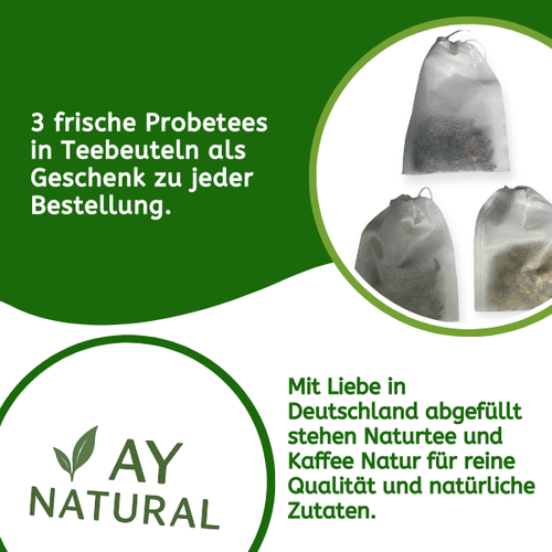 Die Lieferung wurde sofort ausgeführt und kam prompt an. Der Tee hat ein tolles Aroma und schmeckt hervorragend. Ich finde es super toll. Auch ist es für eine Person schön, dass man nur 50g von jedem Tee kaufen kann und die vielen unterschiedlichen Sorten auch erst einmal versuchen kann. Ich werde auf jeden Fall wieder bei Bedarf, bei AY Natural einkaufen. Einfach super. Vielen Dank