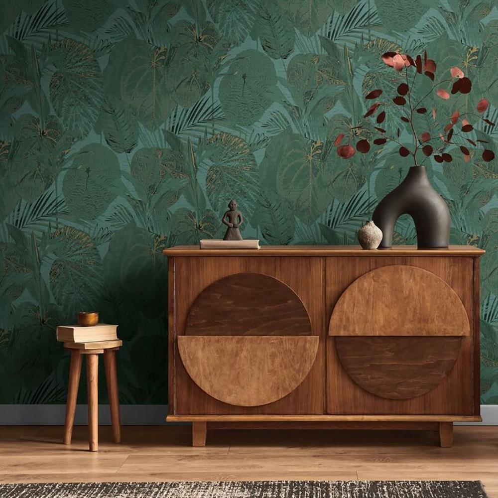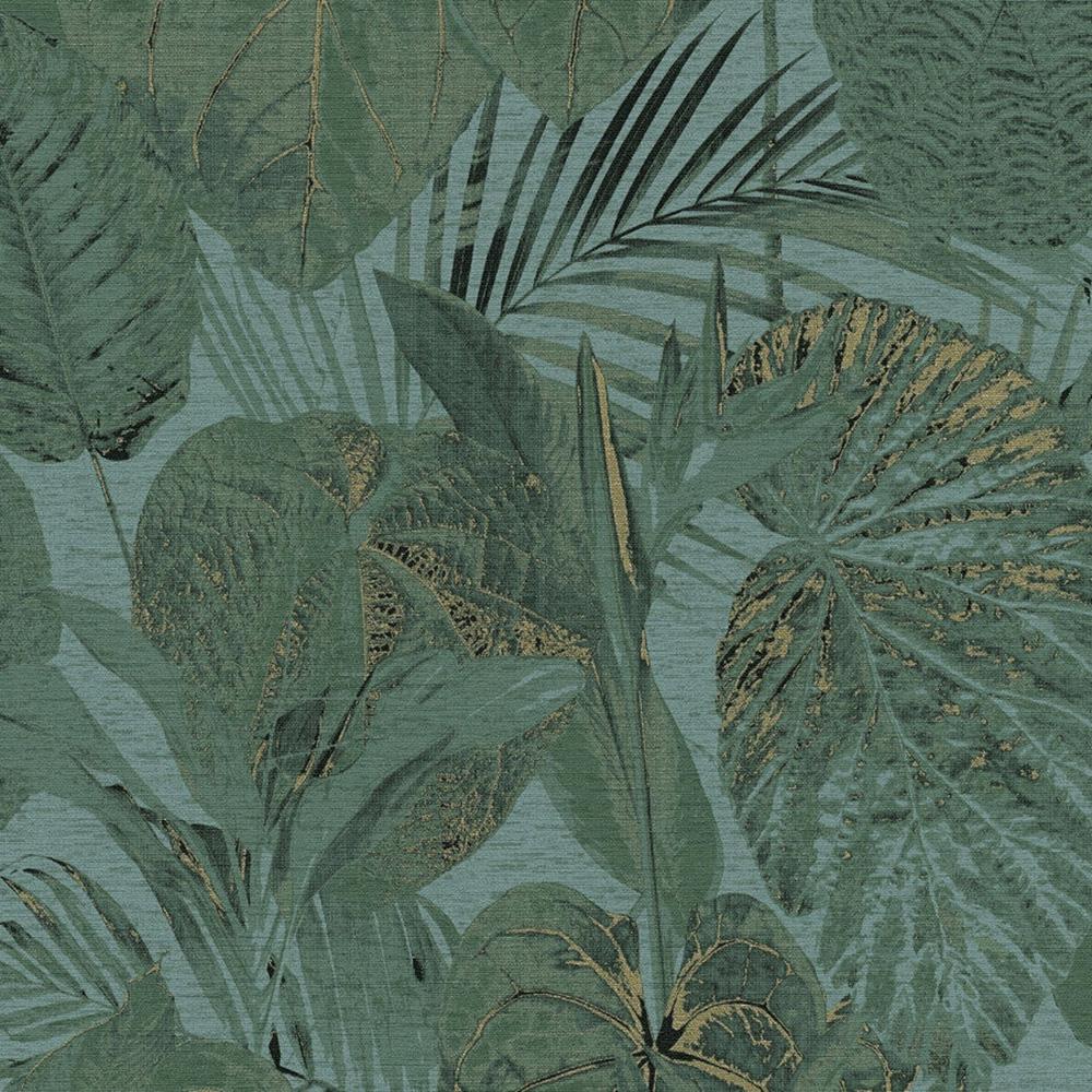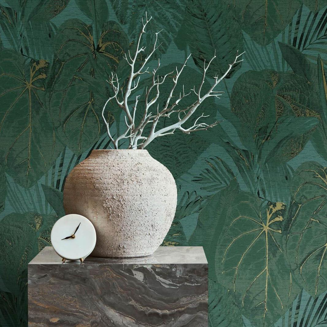 Add a touch of nature to your home with this stunning botanical wallpaper. It features a large tropical leaf design in a dark green colourway with metallic gold detail throughout. Set on a textured vinyl background for a truly mesmerising wallcovering.
