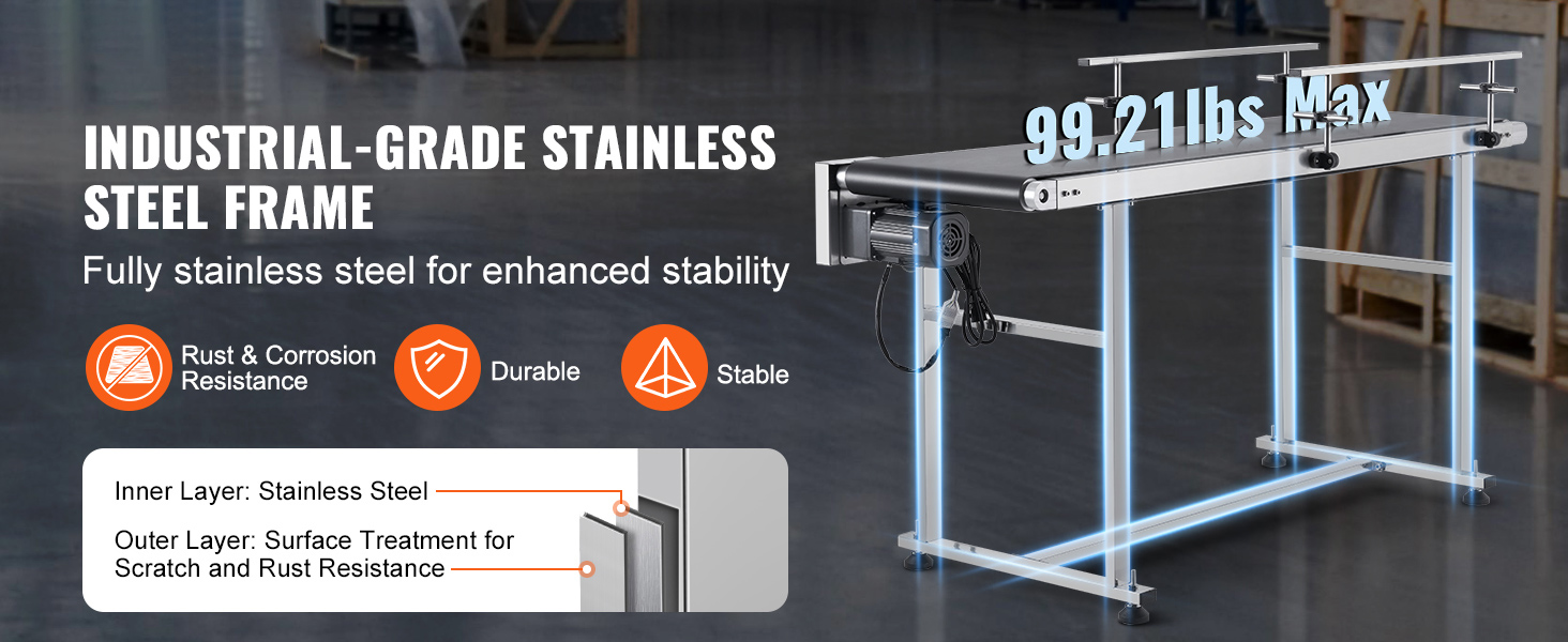 Say goodbye to flimsy conveyors! Our belt conveyor boasts a solid stainless steel structure that ensures stability and durability, handling heavy loads and long hours like a pro. Plus, its scratch-resistant and rust-proof exterior keeps it going strong even in tough conditions.