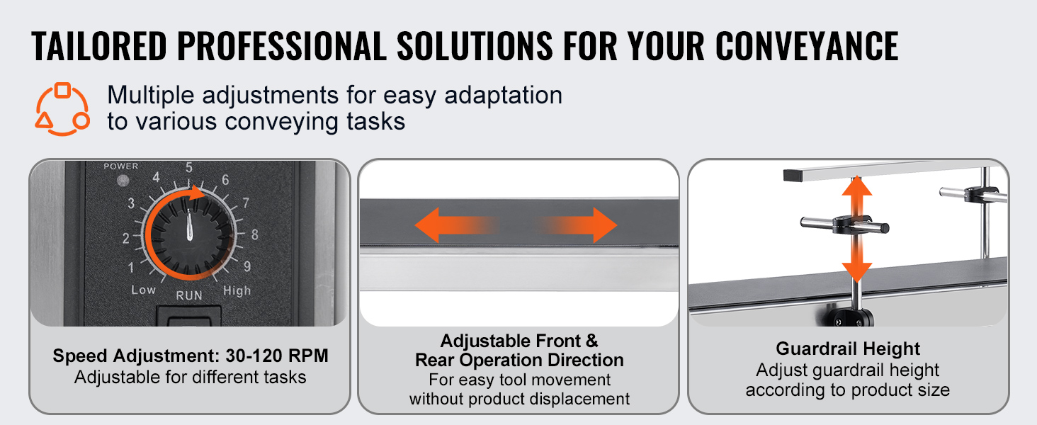 Our PVC flat belt conveyor has got you covered with its multifunctional adjustment capability. From adjustable speeds (30 to 120 RPM) to bi-directional operation, it adapts to your needs. With customizable guardrail heights, security and efficiency are ensured!