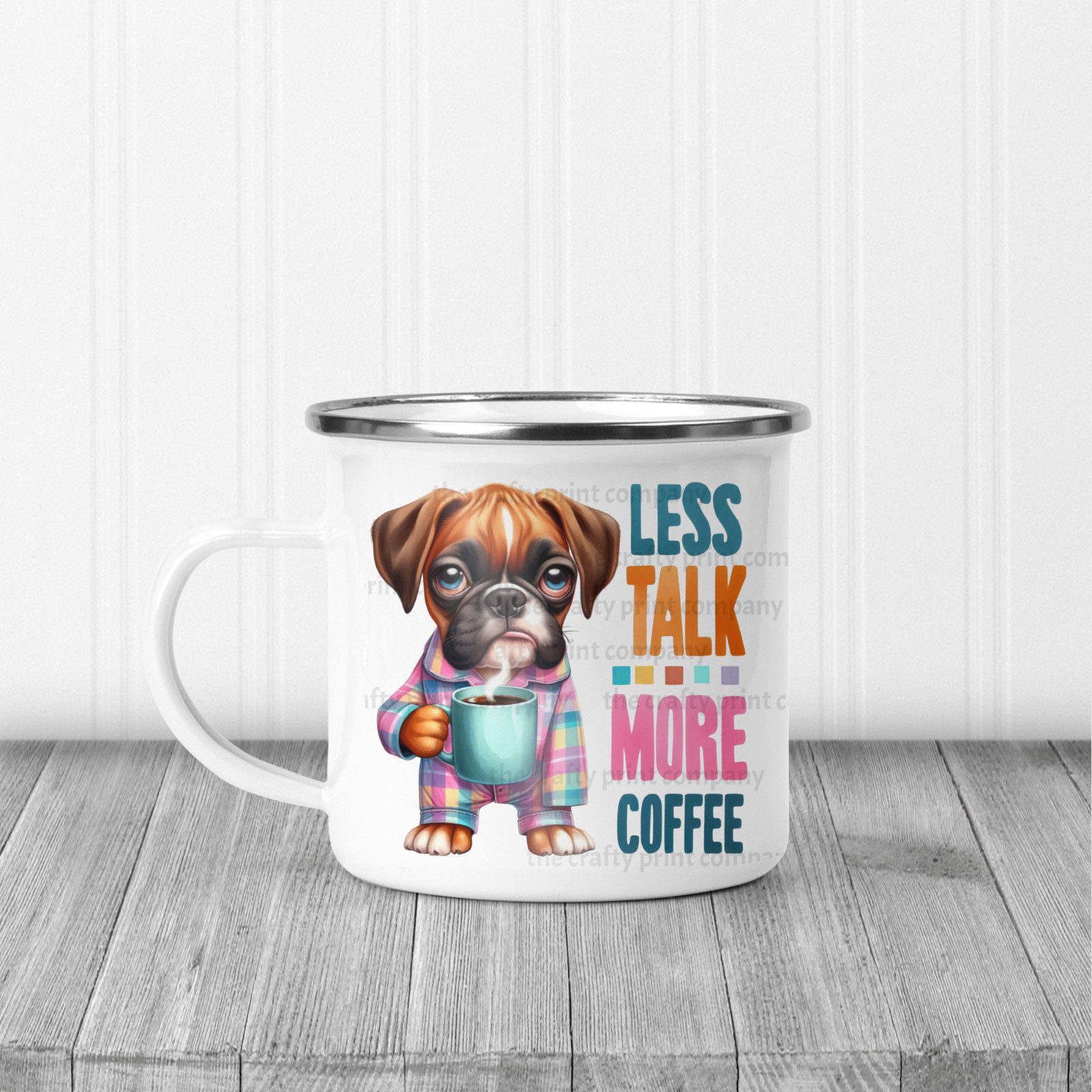 12oz enamel mugs with silver rim.