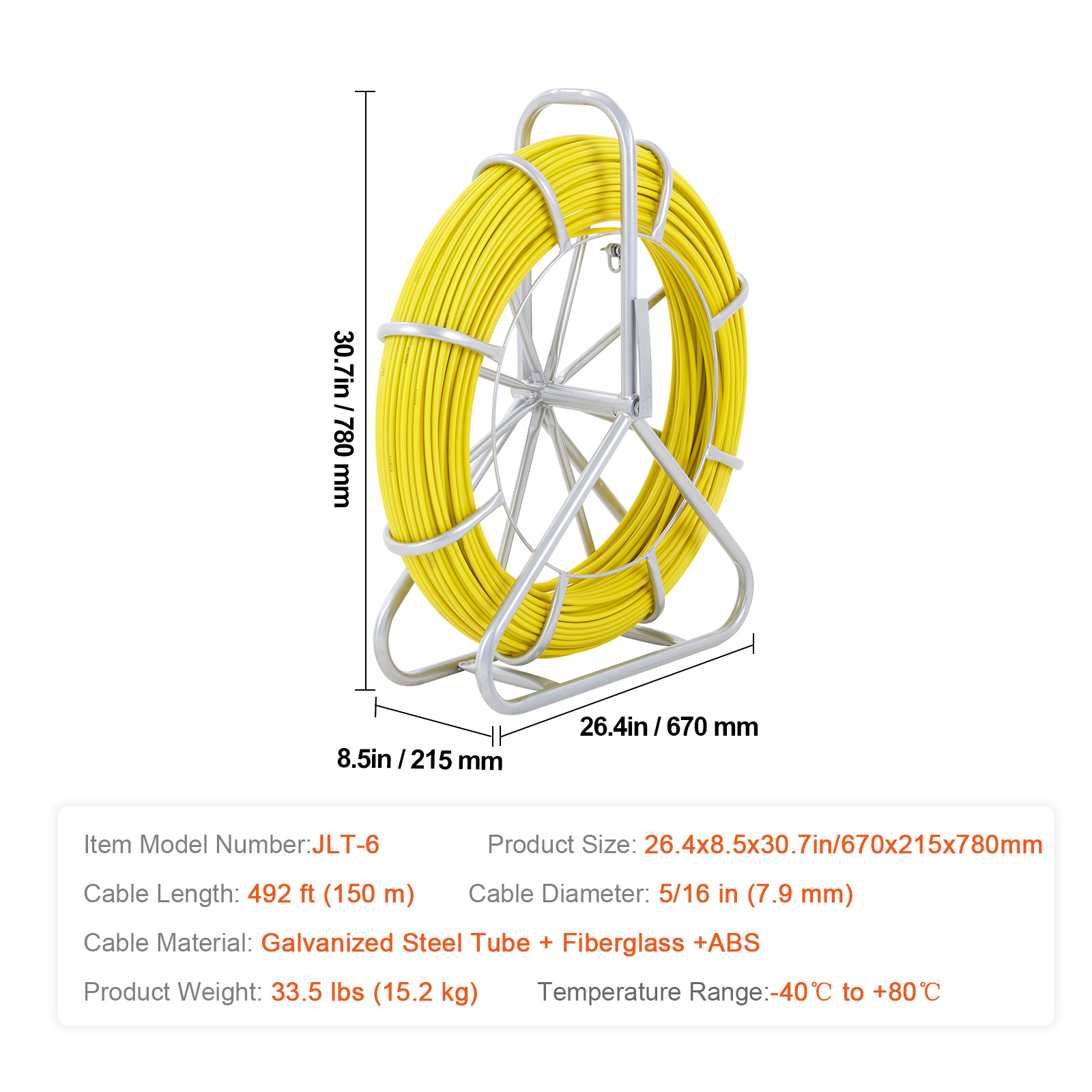 Full-Metal Frame: The fiberglass fish tape frame is welded from high-quality steel, ensuring durability and providing excellent stability even in different terrains. Its painted surface is resistant to rusting. The top handle design facilitates easy carrying and allows for free movement.