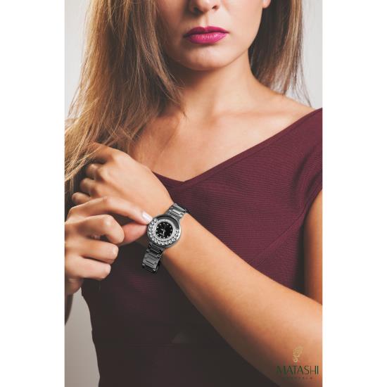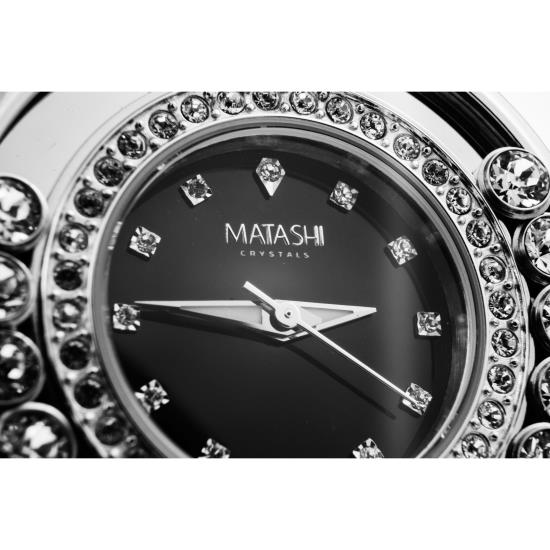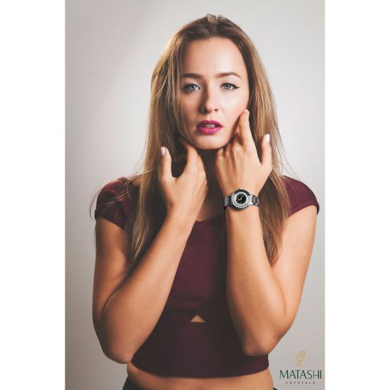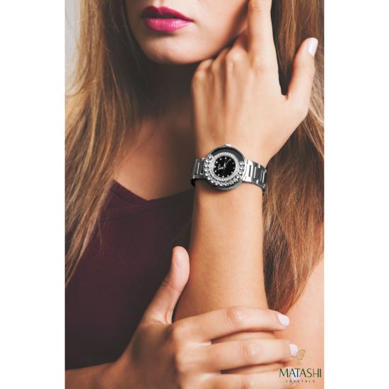 This elegant 18k white gold plated watch with a black watch face, sparkles with beautiful shimmering Matashi crystal accents for a truly chic look. The crystals around the face move when you move your arm and dazzles with the sheer radiance of this exquisite crystal-encrusted timepiece! Crafted with quality materials like 18K White Gold and embellished with high quality Crystals means that this watch is a winner wherever you decide to wear it!