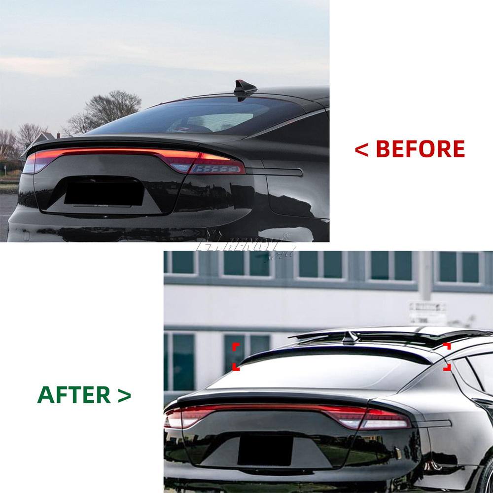Rear Roof Spoiler Lip For KIA Stinger 2017-2023 PACKAGE INCLUDED: 1x Rear Roof Spoiler Lip (Tape-On Installation) FITMENT: For KIA Stinger 2017-2023 SPECIFICATION: Material: ABS Spoiler Color: Glossy Black Fitment Type: Installed By Double-Sided Tapes. Apply Area: Rear Roof Instruction: 1.Test fitting the spoiler and mark the place where you are going to apply. 2. Cleaning the applying area with some alcohol or detergent or water or something (we don’t provide cleaning tools). 3. Hold the Spoiler on place and apply some extra tapes to help you adjust the position end-by-end. 4. Once everything is lined up, peel off the red skin on back to apply the double-sided tapes. 5. You need to press these spoiler in a few minutes to reinforce the attaching. FEATURE: Direct Fit. Easy install and durable use. Great quality and great Fitment. Correct Connector No cutting or splicing. Strict quality control standards to Build and test. It'll give you a sporty look without making it too aggressive. Light in weight and enduring, different optical line comes from different points of view. *Instruction Not Included, Professional Installation Is Highly Recommended.*