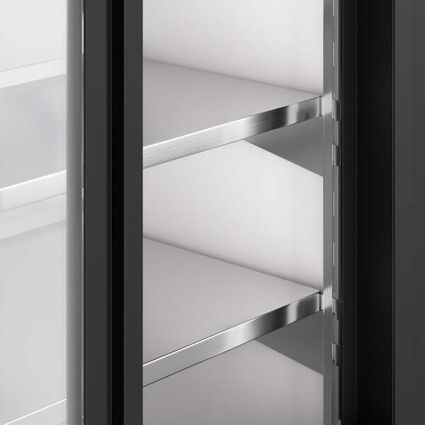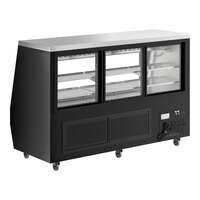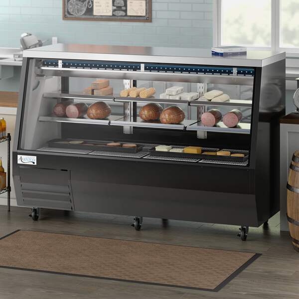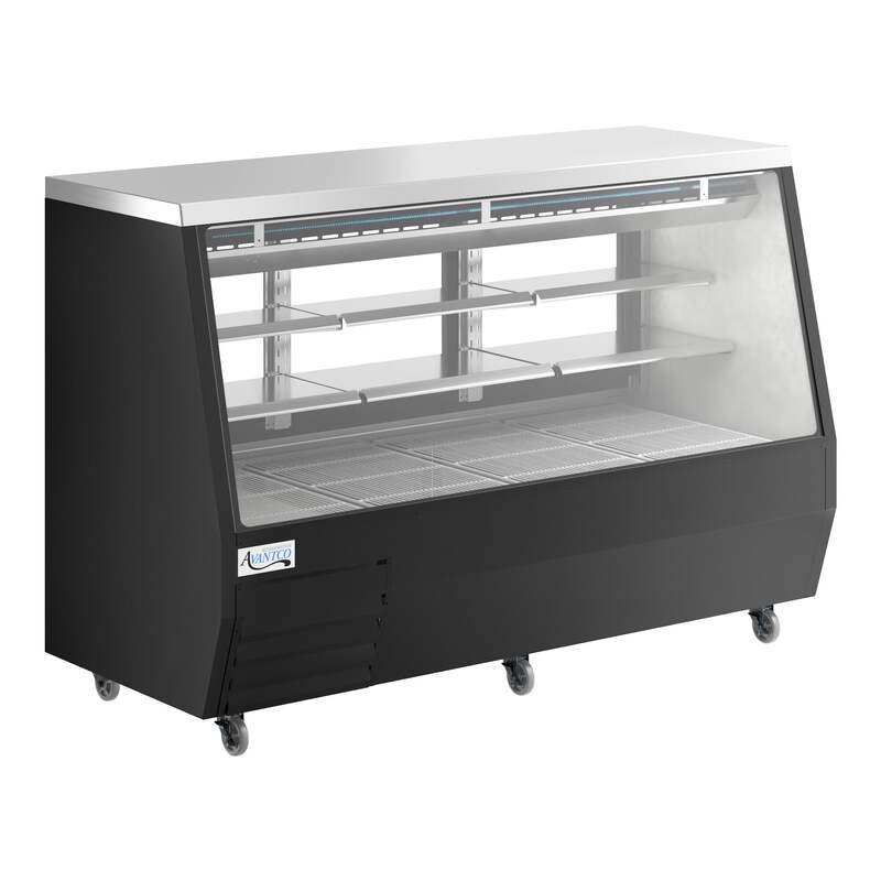 Attractively present your fresh cheese, meat, and other refrigerated deli items with the Avantco DDLC-84-B 84" black square glass refrigerated deli case! With a sleek, square glass design, this contemporary case keeps contents sanitary while beautifully displaying them on the 6 stainless steel solid shelves and 4 epoxy-coated bottom shelves. With added storage underneath, this unit is easy to restock and helps save space in your establishment. Crisp, internal LED lighting provides superior visibility for your products. Having a deli case is sure to boost your impulse sales because customers can clearly see the products you're offering behind the strong, damage-resistant glass front. A durable black-painted aluminum exterior and aluminum interior offer long-lasting durability.