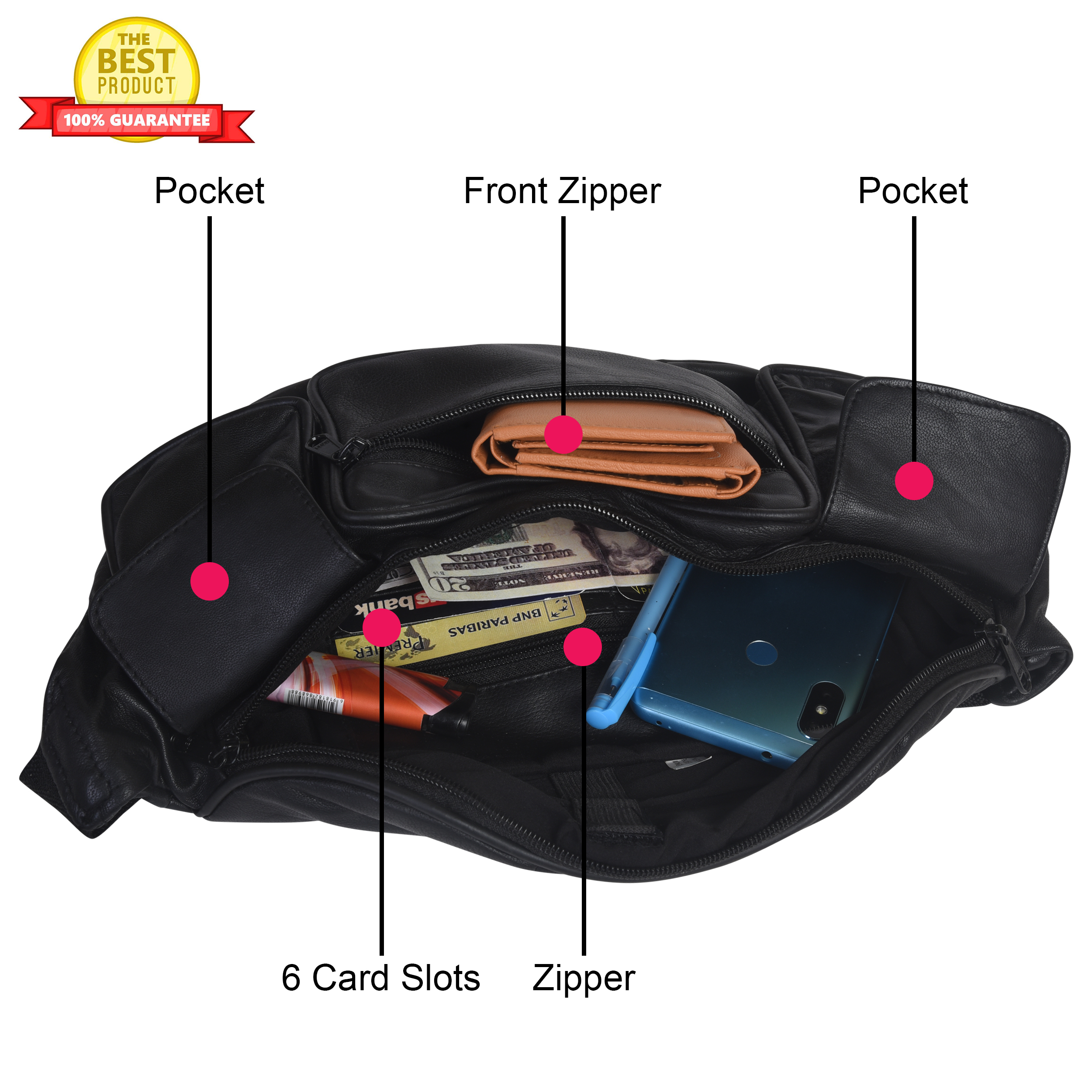A Genuine Leather Fanny Pack Waist Wallet. This Fanny pack has 3 zipper pockets (2 in front and 1 in back), and 2 big Velcro pockets in the front, which can hold phones, money, keys, etc. It has a built in organizer inside the main pocket. The organizer has 6 credit card slots and 1 full size money pocket with zipper closing. It has a strong adjustable strap, which can extend upto 48". Very hard to find wallet. A REALLY GREAT BUY.