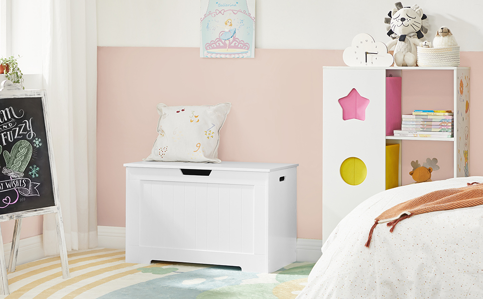 【SICHER, EINFACH ZU BEWEGEN, PRAKTISCH】2 Sicherheitsscharniere verhindern, dass der Deckel abrupt zuschlägt. 2 handfreundliche Seitengriffe, um die Truhe leicht zu bewegen; Öffnung auf der Vorderseite, um den Deckel einfach zu öffnen