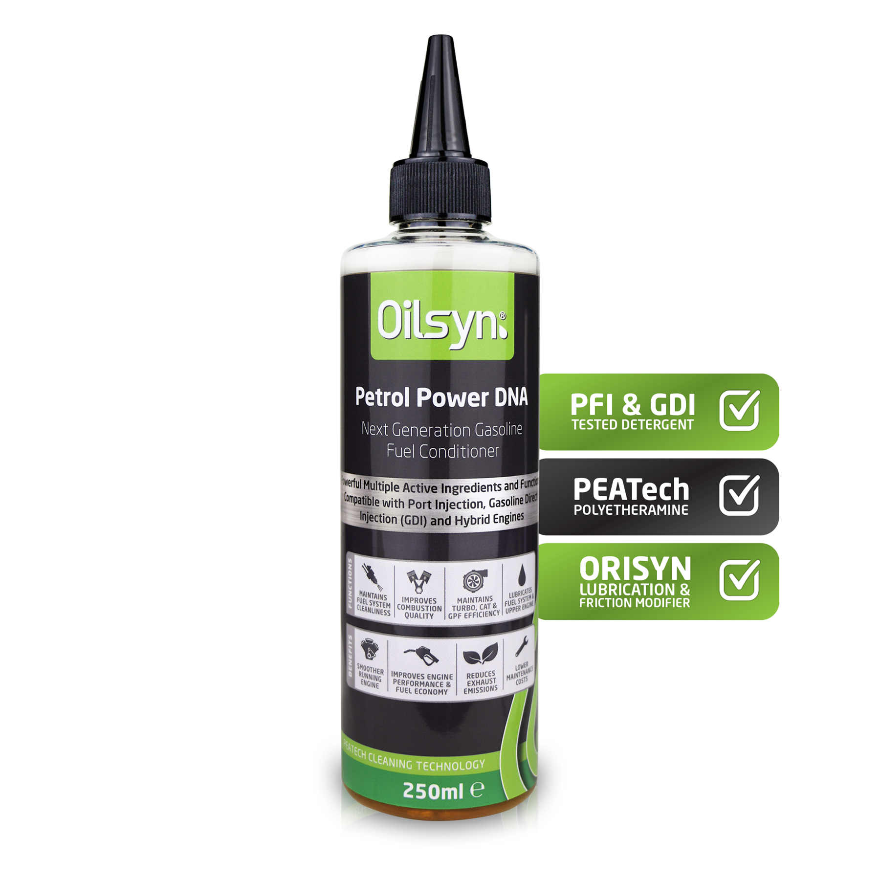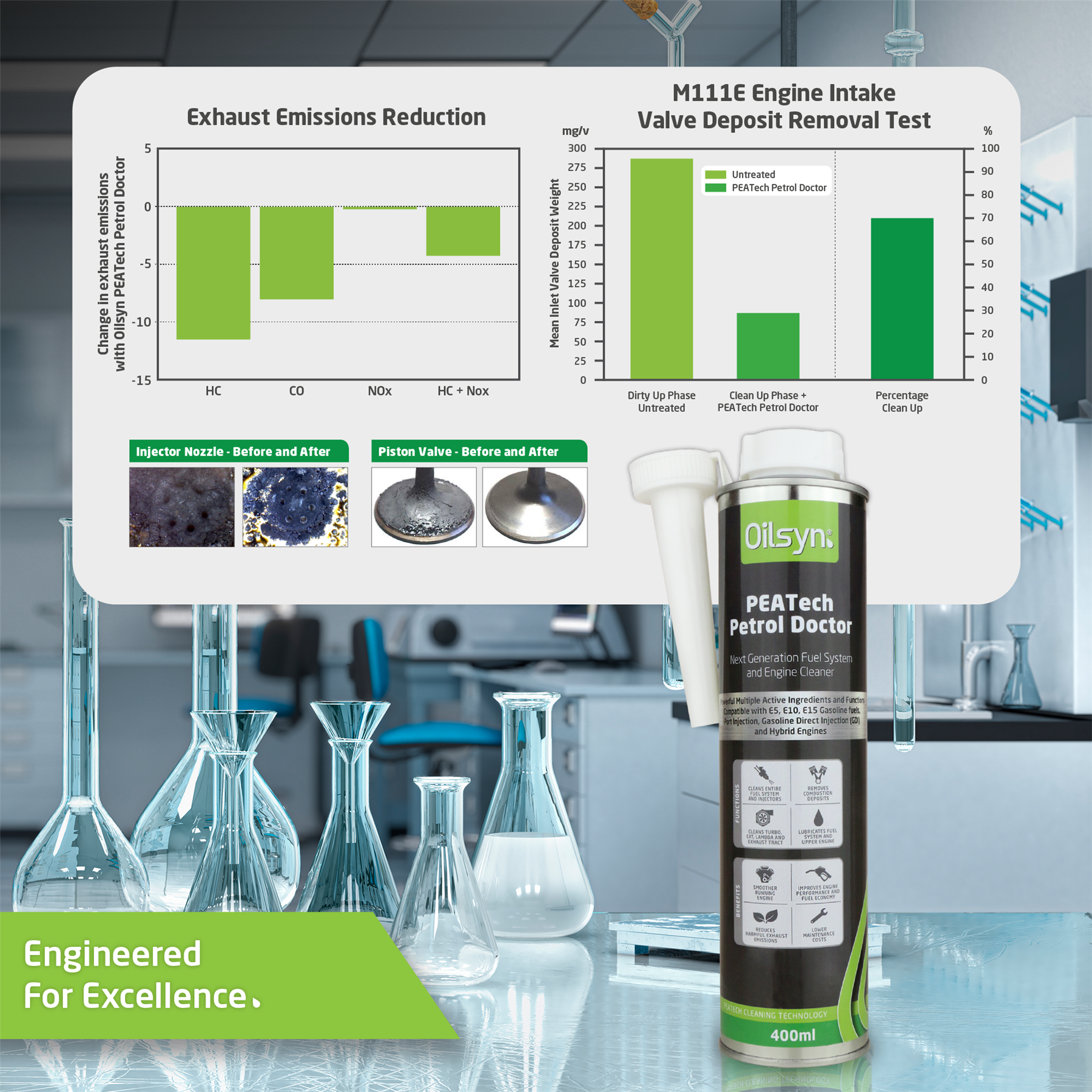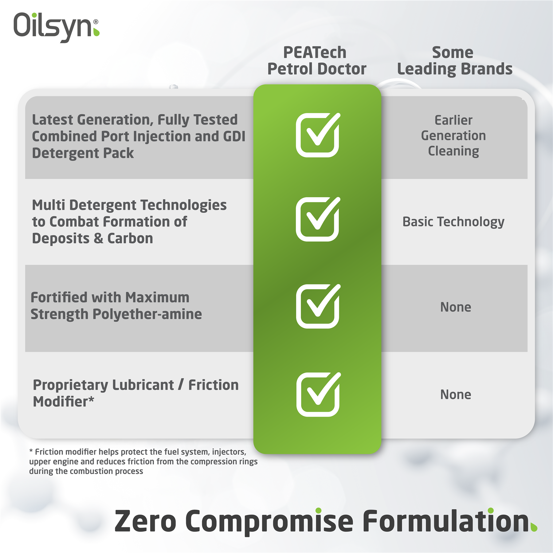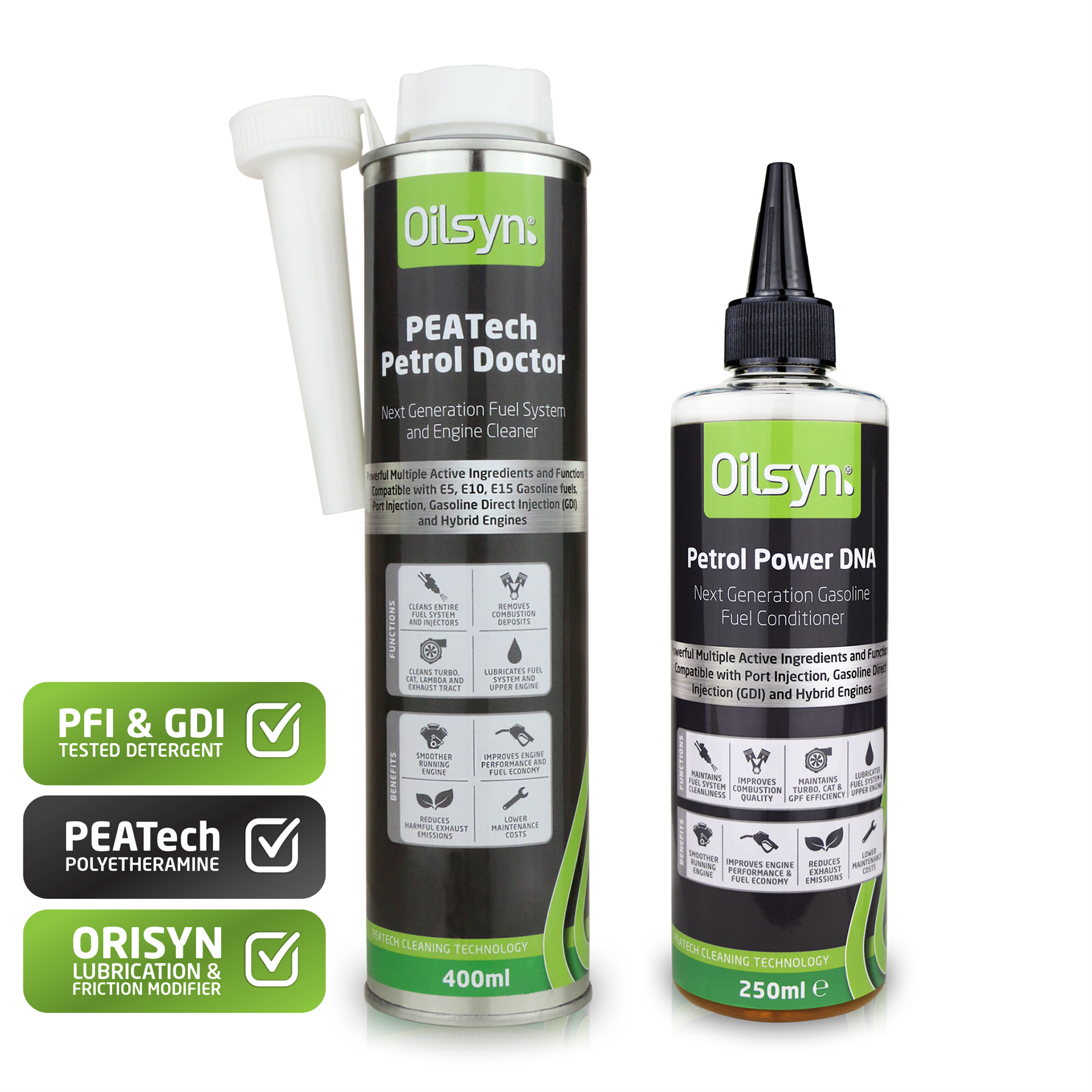 Oilsyn PEATech Petrol Doctor uses a proprietary formulation of active polyetheramines combined with a new dedicated Gasoline Direct Injection (GDI) detergent to safely remove deposits from the fuel system, engine, turbo and catalytic convertor. The combined detergent delivery makes PEATech suitable for both older port injection and modern high-pressure GDI engines that are prone to injector and intake valve fouling. Deposits are systematically and safely removed from critical fuel system and engine components.