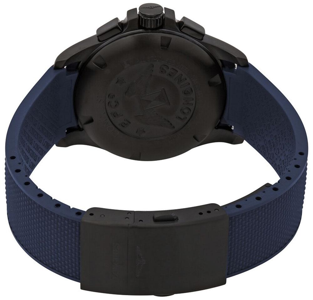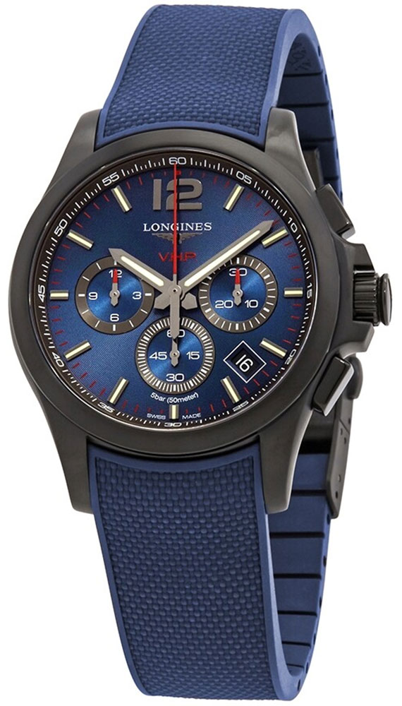 Longines Conquest V.H.P. Chronograph Black PVD Blue Rubber Strap Blue Dial Perpetual Calendar Date Quartz Mens Watch Model# L3.717.2.96.9 / L37172969 features a black PVD coated case that holds the blue sunray dial. The dial has black and luminous hands, a red second hand, black and luminous indices (Swiss Super-LumiNova®) and Arabic numeral at the 12 o'clock position, a date display window between the 4 and 5 o'clock positions, Chronograph functions; 60 seconds, 30 minutes, 12 hours; and a solid case back. The blue rubber strap has a folding clasp with push-button deployment. This watch runs on a Swiss quartz chronograph movement and is water-resistant up to 50 meters/165 feet.