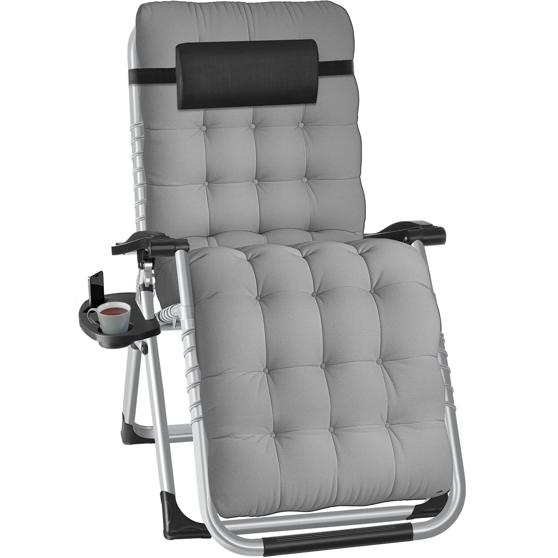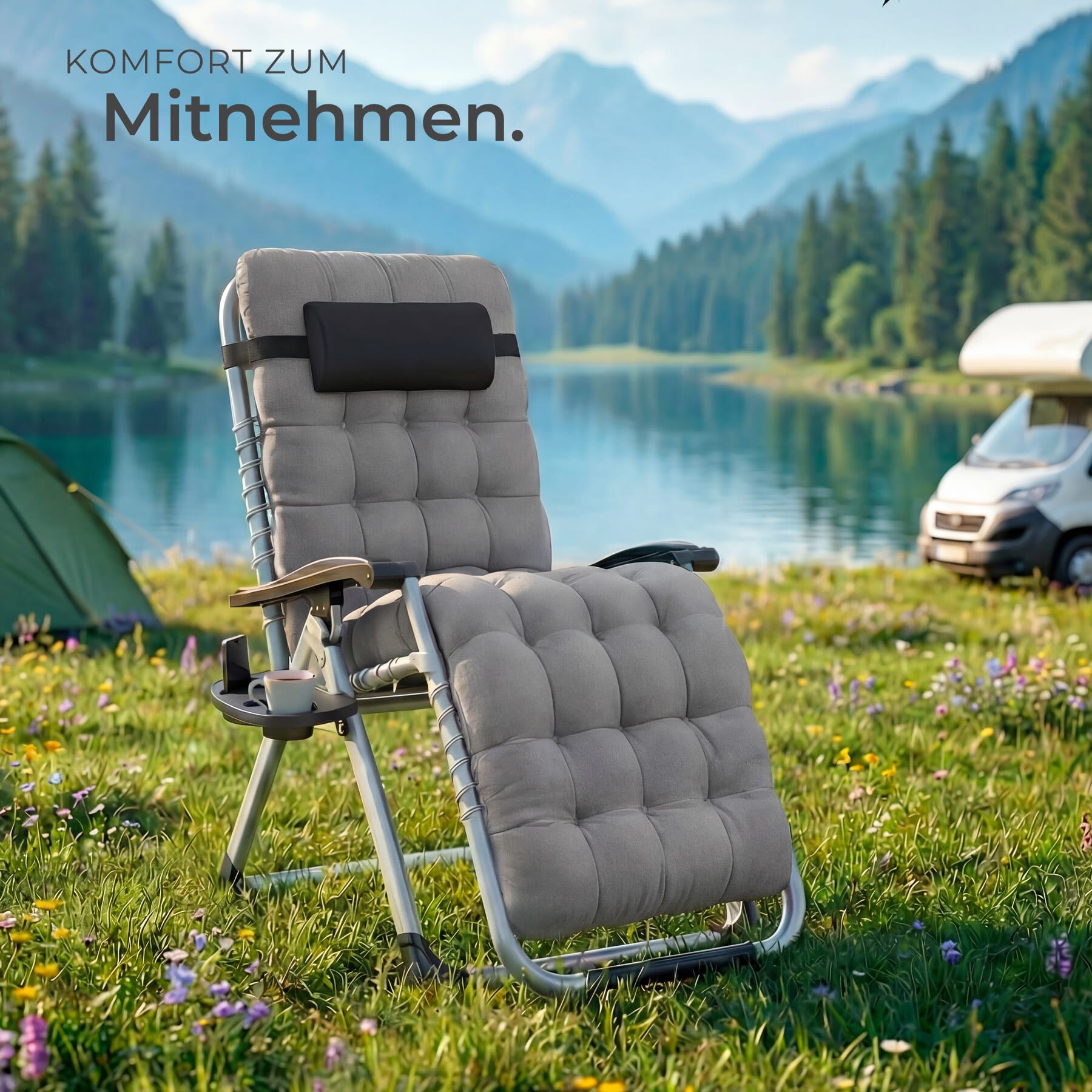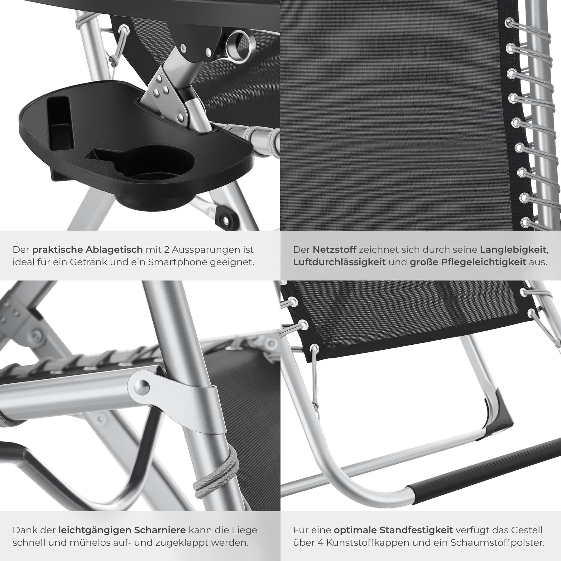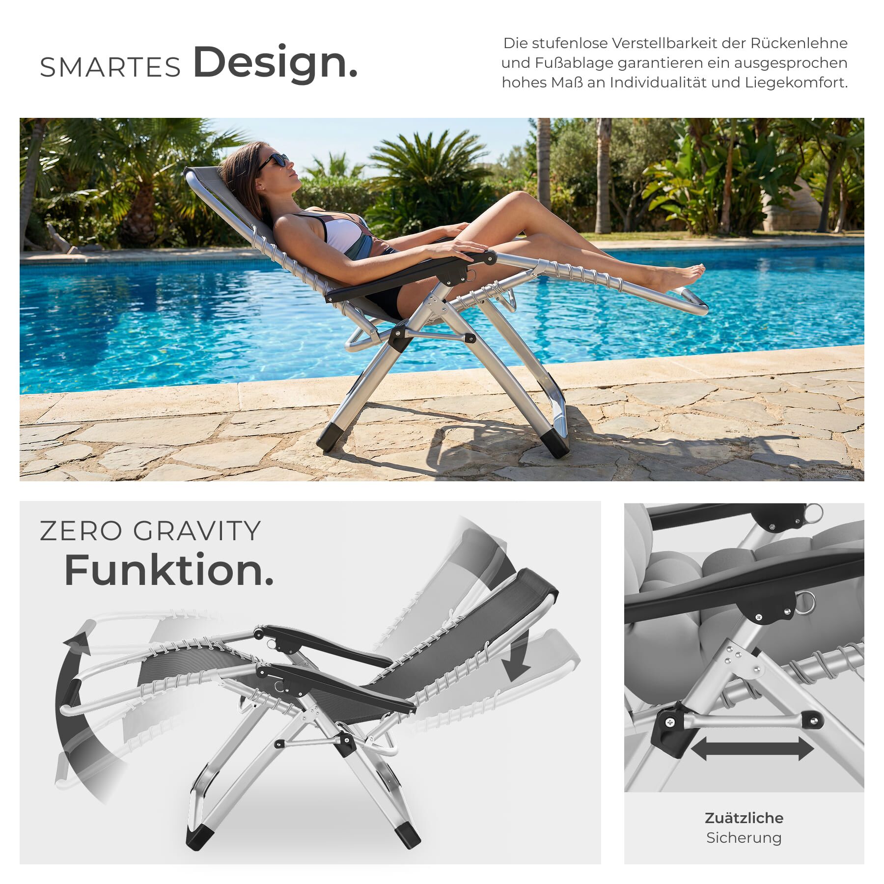 - Stufenlos verstellbare Rückenlehne und Fußstütze von sitzend bis zur Zero-Gravity-Position