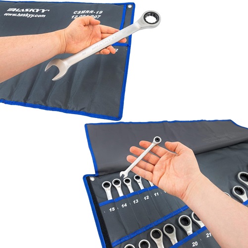 MOBILE AUFBEWAHRUNG: Hochwertige Stofftasche mit Klettverschluss für optimale Organisation und Transport des Werkzeugsets - Alle Ratschenschlüssel übersichtlich sortiert