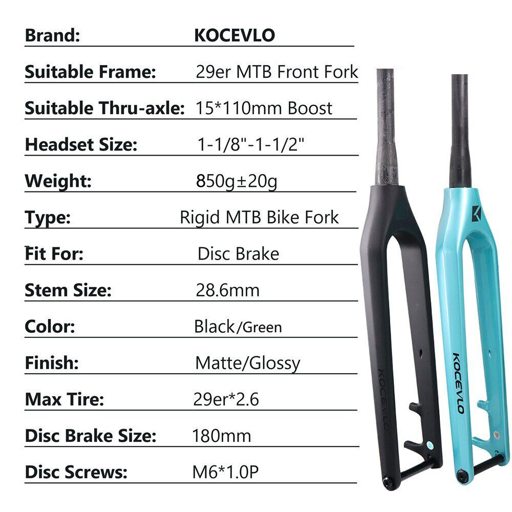 Color: Black /green Maximum tire size installed: 2.6in Weave: UD Suitable Frame: 29er Headset Size: 1-1/8"-1-1/2" Weight: 850+/-40g Fit For:Disc Brake Suitable Thru-Axle Size: 15*110mm (BOOST)