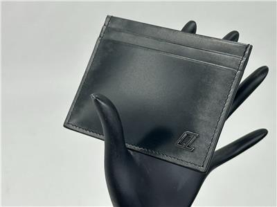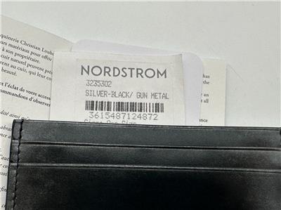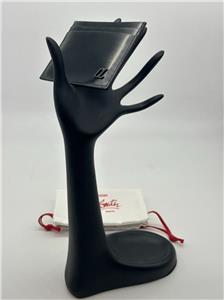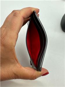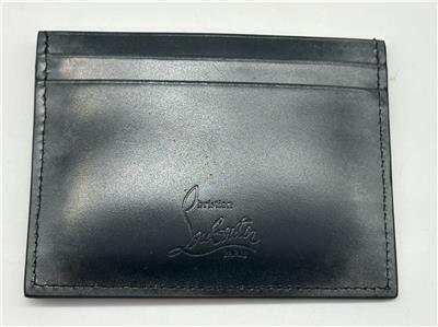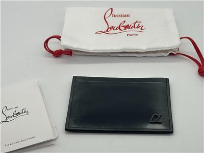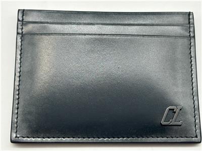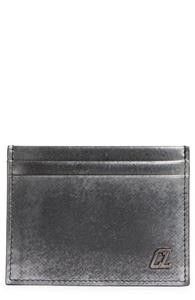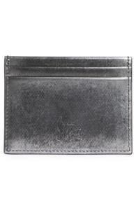 A CL logo that echoes the iconic Happy Rui sneaker details the brushed-metallic calfskin exterior of a slim card case with a signature Louboutin-red interior.