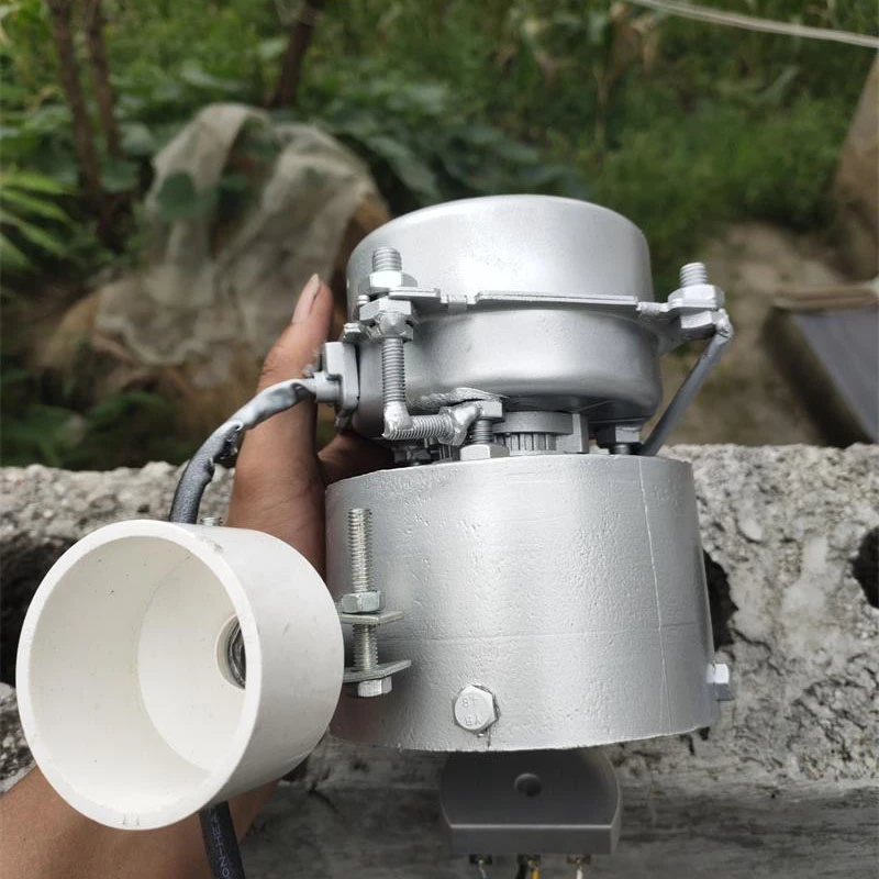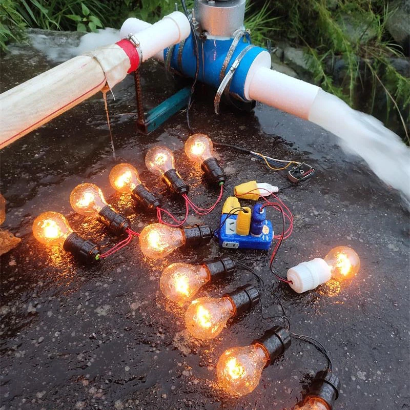 nstructions for hydraulic installation of micro-hydrogenerator This description applies to the description of the drop of 50 mm pipe through the water pipe. The 50 pipes of this generator can be used as a reference for the description. They are all tested. The drop is based on the vertical drop as the standard. The length is not used as a reference. The vertical height is accurate. The vertical height is 10 meters and the drop length is 30 meters. It is only a drop of 10 meters. You say that your pipe is 100 meters or two hundred meters. It is useless, because there is no hydraulic impact force without the vertical drop height. The water volume requires 50 mm pipes to pass through the water pipe. Full tube, the power generation is different with the height of the drop. Taking the 1000 watt micro hydro generator as a reference, the vertical drop of about 3 meters can generate 10 watts to 20 watts, 10 meters can generate 100 watts to 300 watts, and 15 meters can generate 300 watts to 500 watts, 20 meters can generate 500 watts to 700 watts, 30 meters can generate 700 watts to 1000 watts, this is based on the vertical drop as the standard, not your length, generator installation and use please follow the instructions, generator water outlet Connect a drain pipe, try to drain the water as far as possible, connect the pipes around the generator, don't let the water fly around, wrap the leaking place with plastic bag or electric tape, and cover the generator head with something. Put the generator in a place where rain can't soak. Pay attention to all the lines. Do not have a short circuit due to electric shock. The generator is guaranteed for 3 years. The short circuit of the water is not guaranteed. The short circuit of the water is a personal installation and use problem. It has nothing to do with the manufacturer. You install and maintain Connect the water pipe to the leaking and sprinkler, and connect it to the line, and all these things will not happen. Please use it strictly according to what we said. The important thing is to say three times. The water pipe is connected to the outlet and the drain is connected. The pipe drains the water away. You can buy a sewer drain pipe PVc to connect to the generator outlet. The generator's outer diameter should be larger. It can't be inserted directly. Bake the PVC connector with fire and put the plastic connector. Use fire to soften it and then it can be put in. After putting it in, seal the gap with AB glue. The generator only needs to pay attention to the waterproof work, and the others don't care about it. |