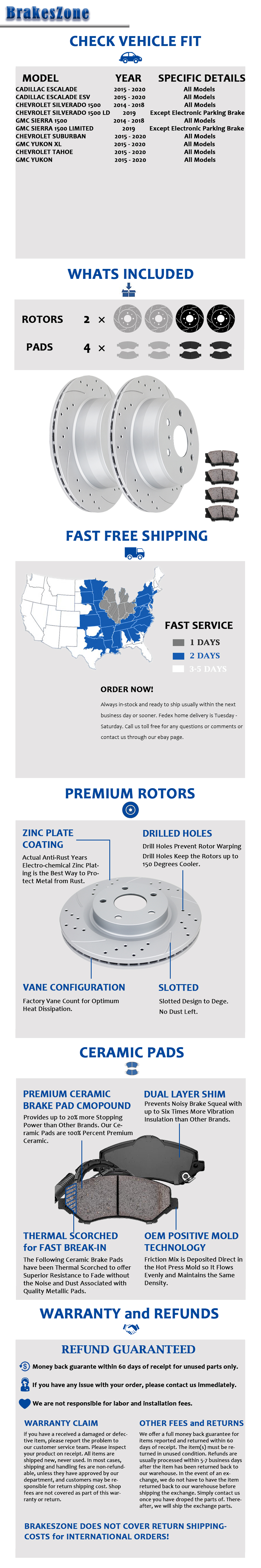 REAR Brake Rotors Pads fit for Chevrolet Tahoe GMC Yukon 2015-20 Slotted Brakes
