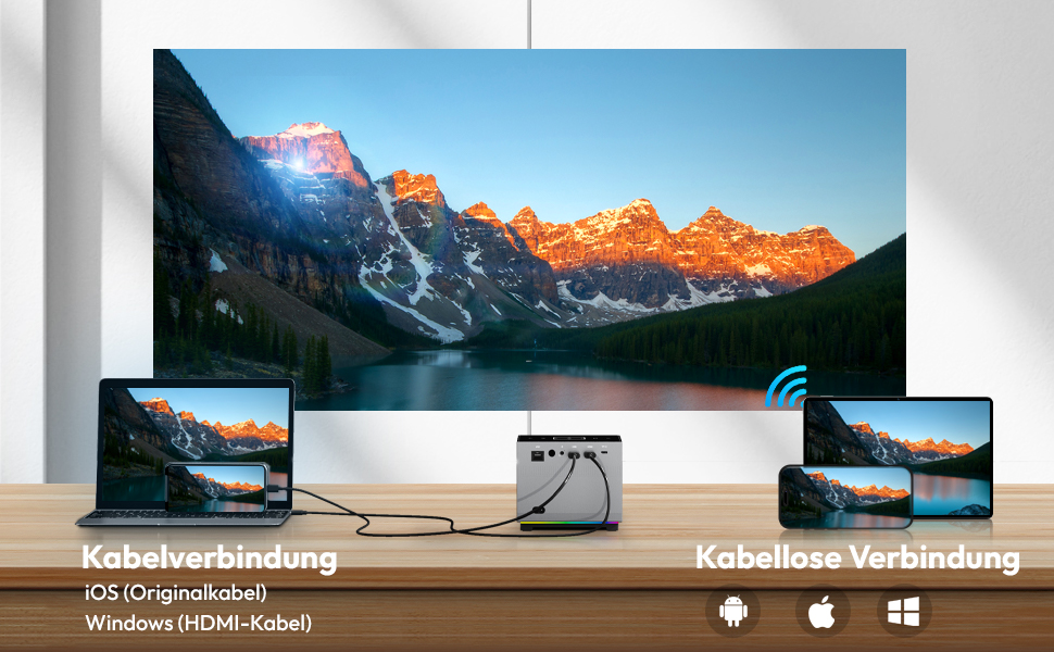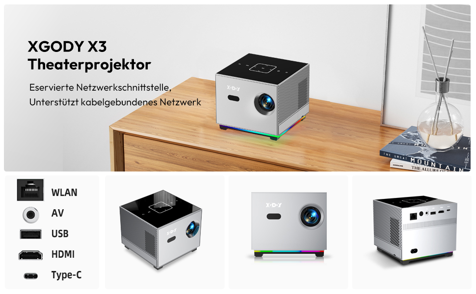 Der XGODY X3-Projektor verfügt an der Unterseite über einen RGB-Lichtstreifen mit zehn Beleuchtungsmodi zur Auswahl, die Ihnen ein stärkeres Atmosphärengefühl vermitteln.