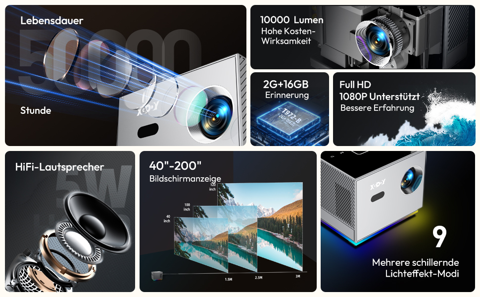 Der X3-Projektor verfügt über ein Kontrastverhältnis von 5000:1, unterstützt 4K-Auflösung, 10000 Lumen und eine LED-Lampenlebensdauer von 50.000 Stunden. All das ermöglicht Ihnen, das glückliche Home-Entertainment zu genießen.