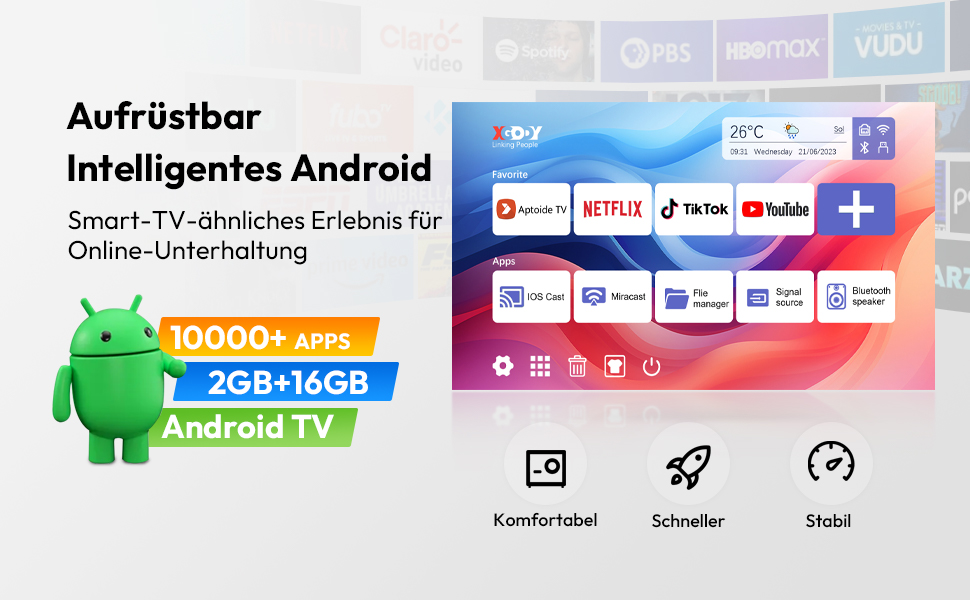 Basierend auf einem Android-System. Es kann Apps wie Netflix, HBO Max, Hulu, Prime Video, Apple TV, Flixster, Youtube TV ausführen. Sie können auch neue Apps vom Appstore herunterladen.