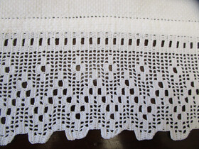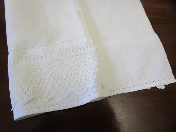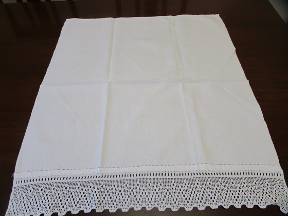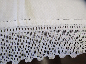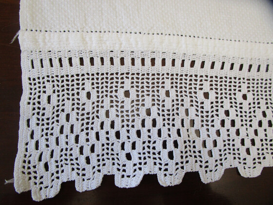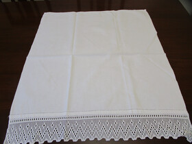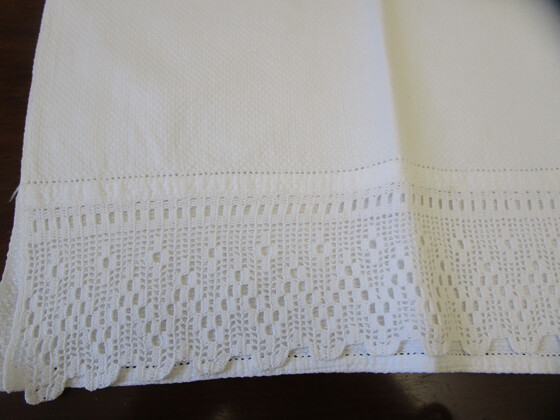It has a wide hand worked filet crochet lace edging at one end with a pulled thread hem at both ends.