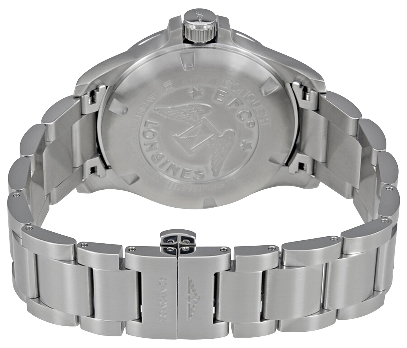 Longines' Conquest V.H.P. which stands for Very High Precision, combines high technicality, innovation and modern aesthetic to reach new heights in quartz-based watchmaking. It features a 41 mm stainless steel case that holds a black sunray dial under a scratch-resistant sapphire crystal. It has gunmetal gray and luminescent obelisk-style hands, applied indices, and Arabic numerals at the 6 and 12 o'clock positions. The bordered and beveled date aperture at the 3 o'clock position is adjacent to the protected smart crown wherein controls for time-setting can be minimally operated minute by minute or hour by hour. It is also equipped with a perpetual calendar that no longer requires correcting the date. A stainless steel bracelet with a triple safety folding clasp and push-piece opening mechanism completes the elegant and versatile look. This watch also features a solid caseback engraved with Longines' old winged hourglass logo with the Ernest Francillon & Compagnie signature (EFCo). Encased within is the caliber L288, an extremely precise Swiss quartz movement capable of automatically resetting/correcting the hands in case of shock or exposure to a magnetic field and is water-resistant up to 50 meters/165 feet.