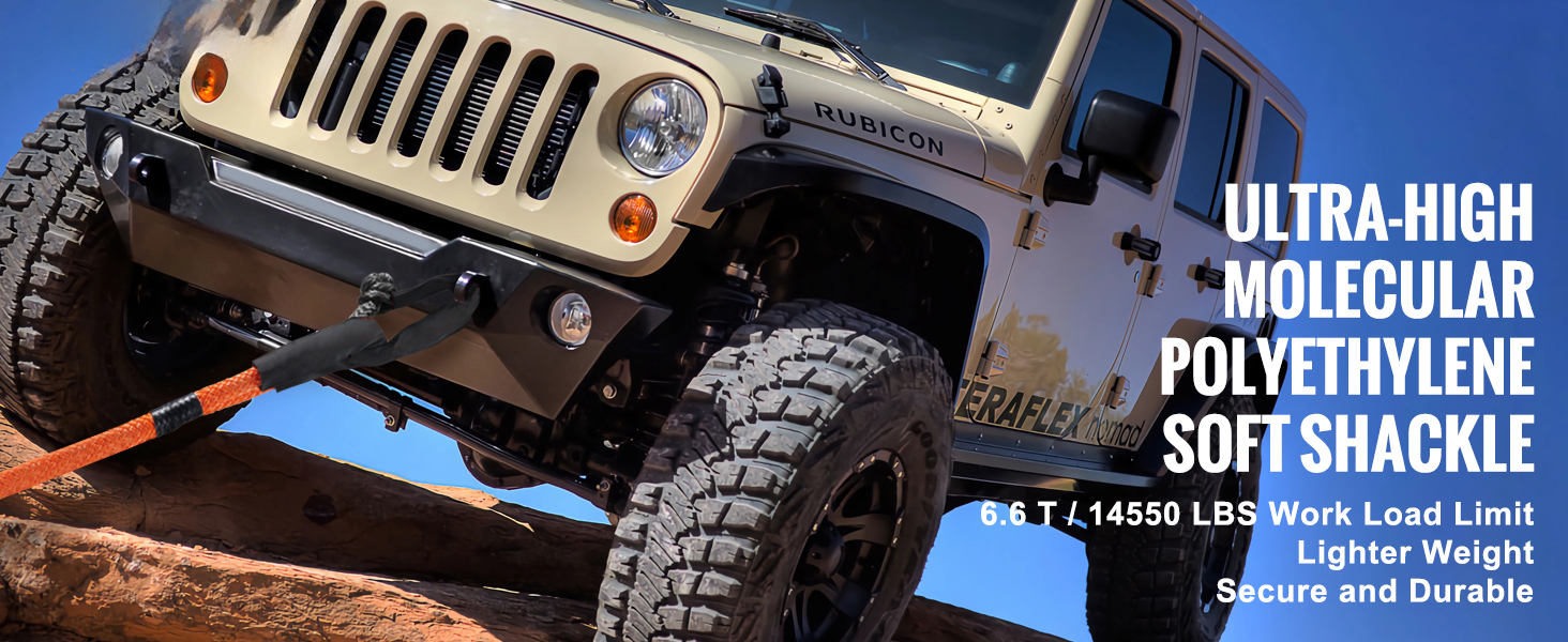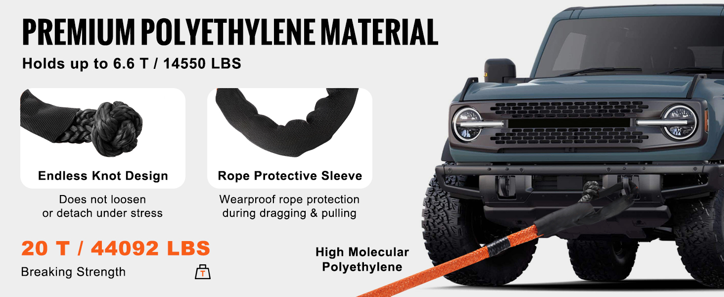Made from high-molecular polyethylene, our soft shackle boasts a breaking strength of up to 44092 lbs/20T with wear-resistant properties. It includes a protective sleeve to minimize rope wear during towing.