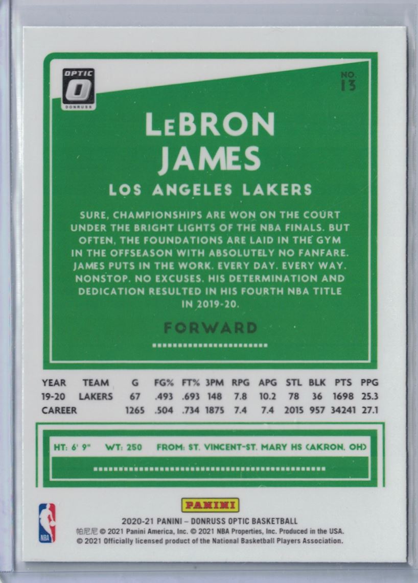 | Description: | LeBron James | | Category: | Basketball | | Year: | 2020 | | Product: | Panini Optic | | Team: | Los Angeles Lakers | | Card Number: | 49 | | Dimensions: | 3½" x 2½" |