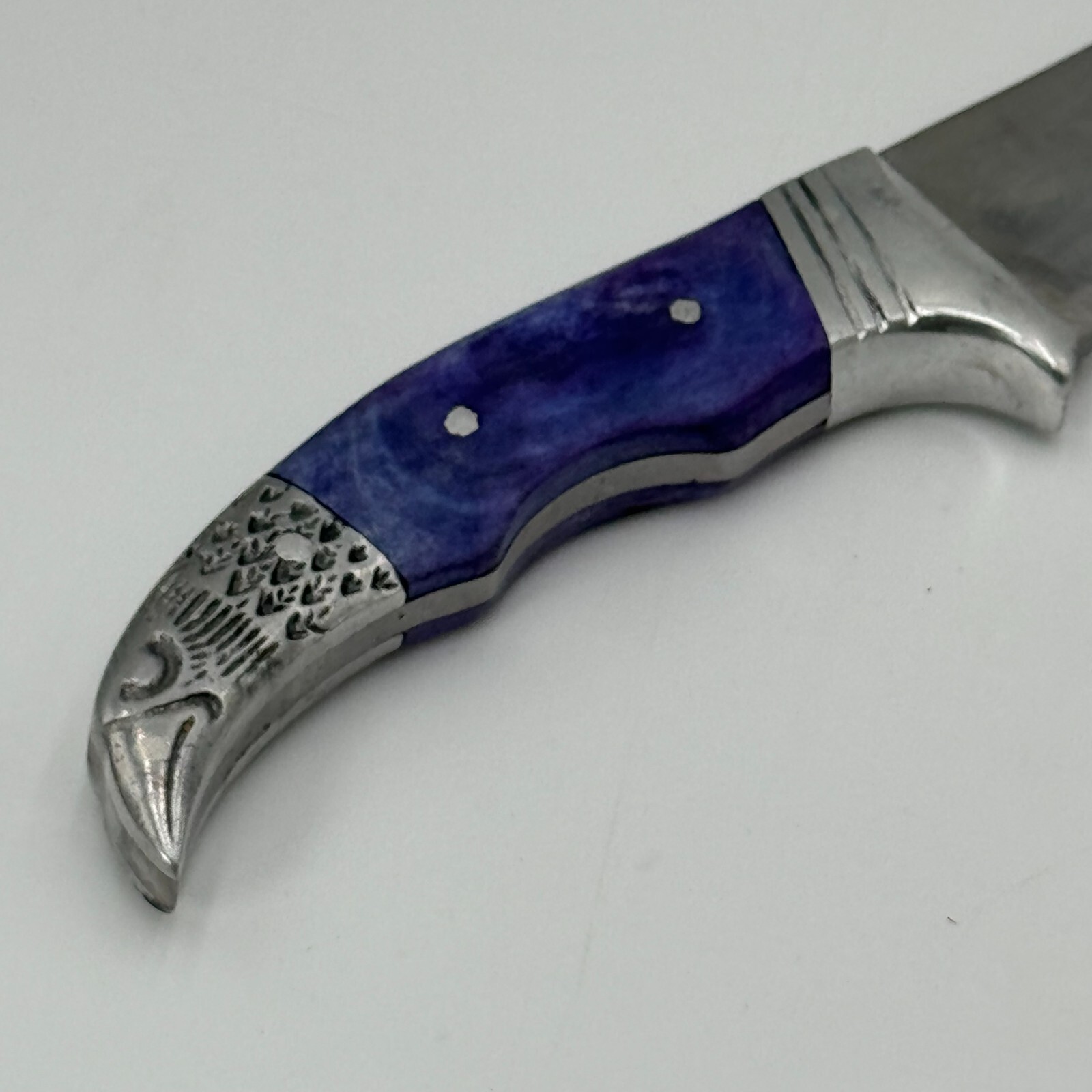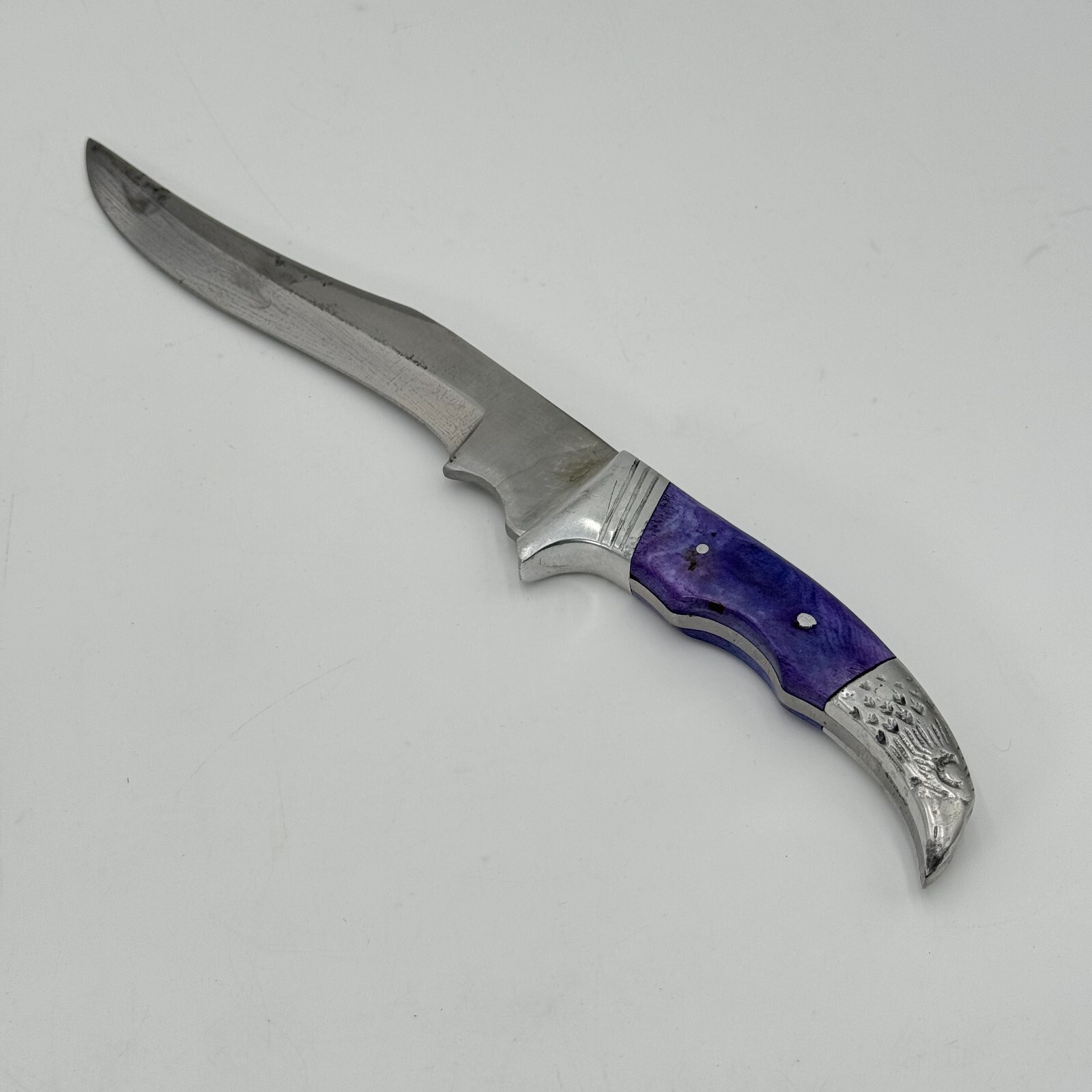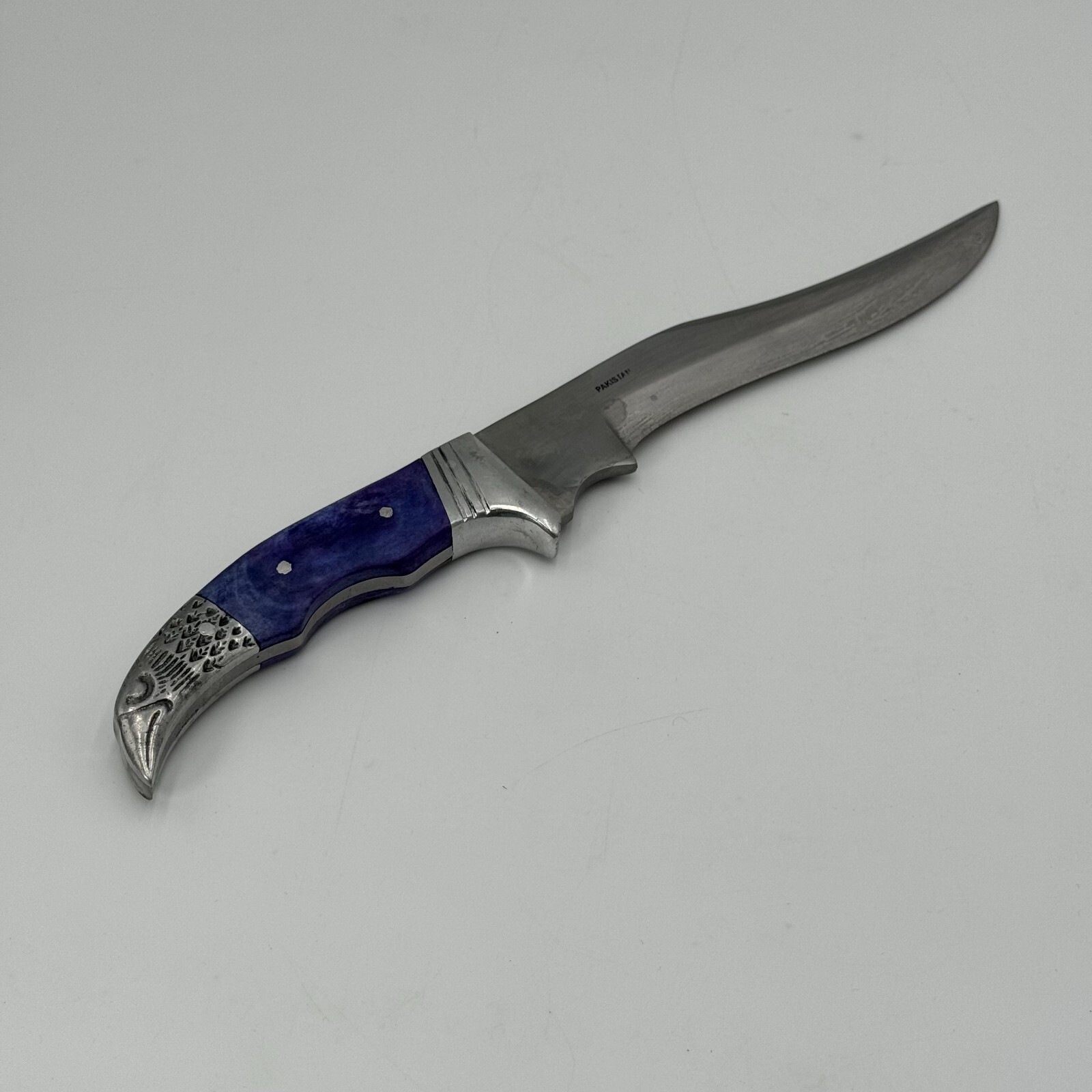 This Pakistan stainless steel fixed-blade knife features a beautiful eagle carving on the handle and a silver blade color.