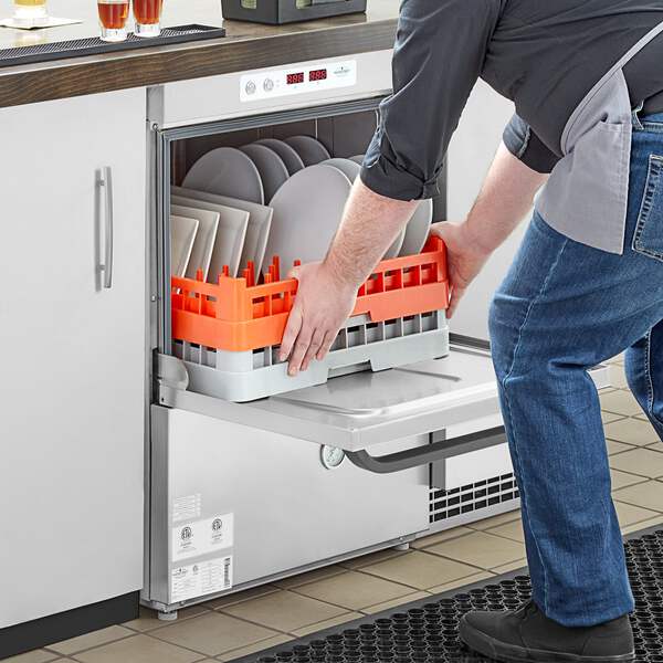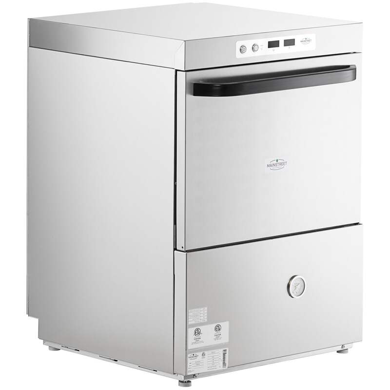 Choose a reliable product with this MainStreet Equipment HTUC high-temperature undercounter dishwasher - 208V/240V, 1 phase. This dishwasher is constructed with durable stainless steel that is sleek and made to last. It is also extremely efficient. It sports a 3/4 hp wash pump motor and uses only .53 gallons of water per rack. It can clean an impressive 22 racks; 792 dishes per hour. This high-temperature dish machine has an operating water temperature of 140 degrees Fahrenheit and a rinsing water temperature of 180 degrees Fahrenheit. This unit is perfect for commercial kitchens, hotels, and restaurant settings.