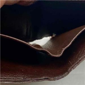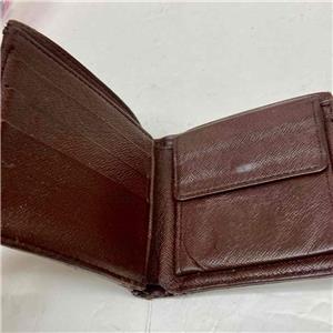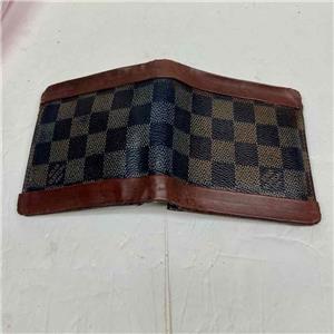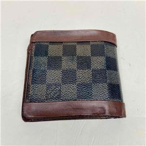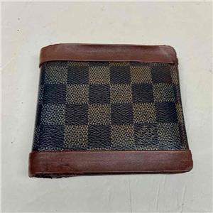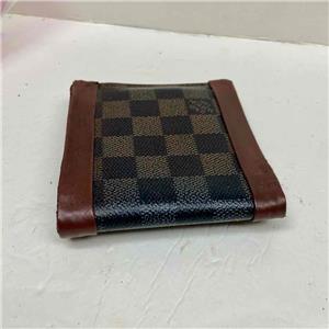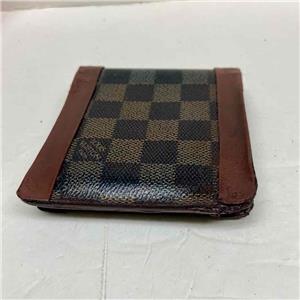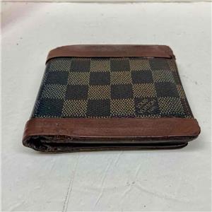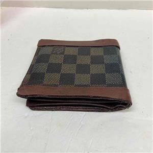 This is a pre-owned mens wallet made of brown checkered coated Canvas. Folded it measures about 4.5 inches long and 4 inches wide. It has repaired edge wear and tear on folded area, discoloration and soiling as shown in photos. Please supersize photos for condition details. Date Code is faint and partly rubbed off.